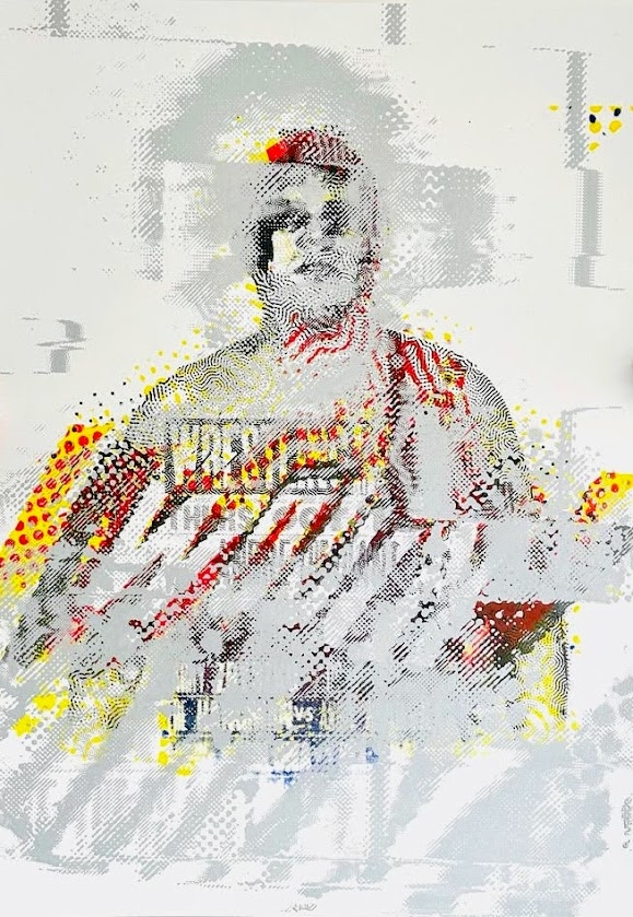 Fotoreproductie van een 5-kleuren zeefdruk -> inkt op 220 g papier - De vijfkleurenzeefdruk toont André the Giant, waarbij zijn iconische beeld versmelt met dynamische onomatopeeën in de eerste vier lagen. Een zilveren overlappende laag creëert een fascinerende 'glitch'-achtige transformatie, die parallellen trekt met het tragische leven van André en andere menselijke uitdagingen. Het werk nodigt uit tot reflectie over geschiedenis en onverwachte levensomstandigheden. De achterkant van het werk is voorzien van een signatuur van de kunstenaar in zilverdruk. Piet zijn werk draait om de herdefinitie van historische iconen in de context van popcultuur. Zijn proces begint met de deconstructie van historische beelden, hij transformeert ze met een nieuwe beeldtaal en narratief, om uiteindelijk te resulteren in een nieuw beeld dat een herkenbare echo van de historische iconografie in zich draagt.