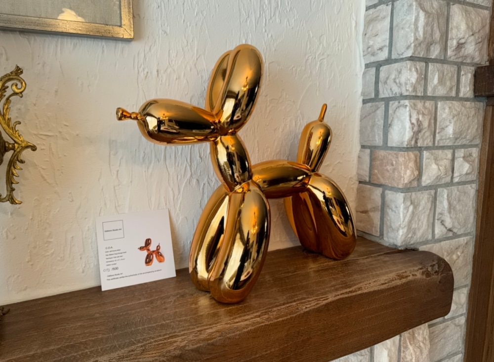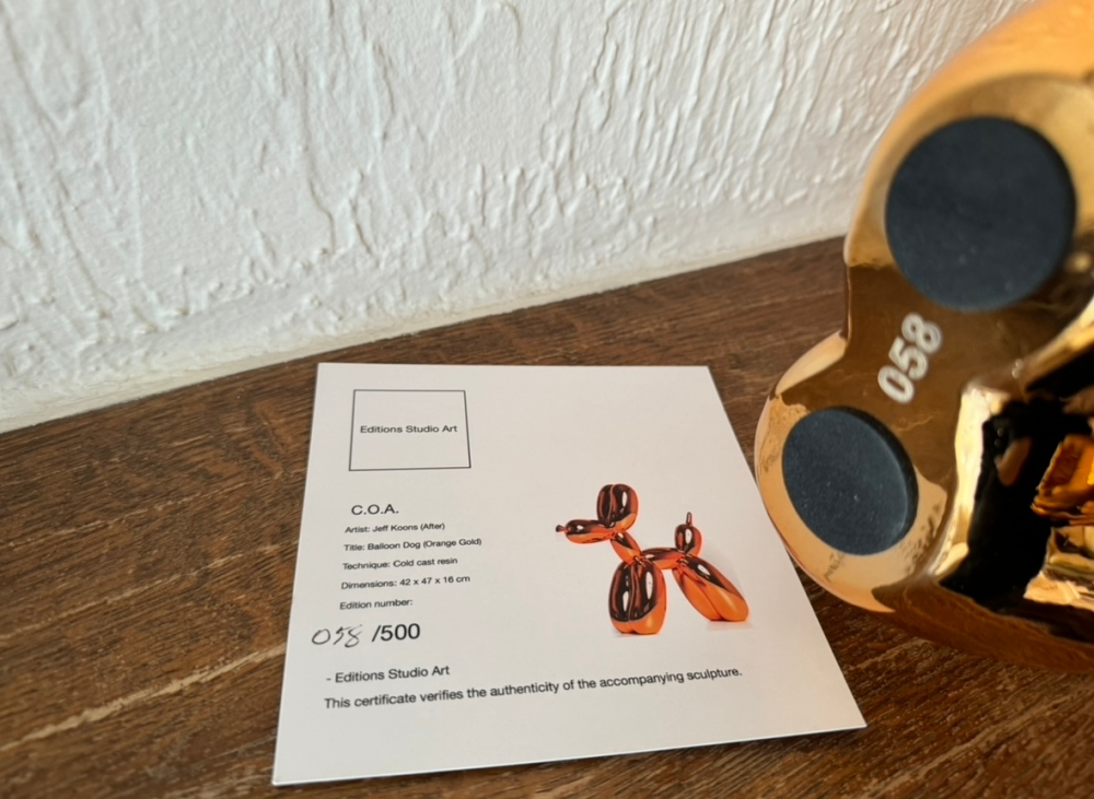 Resin sculpture after Jeff Koons, published by Éditions Studio. Only 500 pieces were produced. This is the first edition and sold out within minutes. The statue comes without any packaging but is accompanied by the original certificate. The box was damaged by water and was thrown away. The statue is in very good to excellent condition. Very safe shipping and no minimum price Very solid investment in this day and age. Rare and sought after orange color. Safe, fast and careful shipping.
