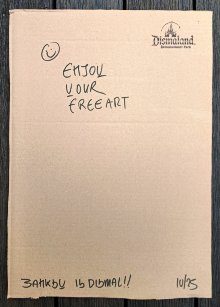Dismaland Souvenir 'Laugh Now' Karton - LE 10/25 w/SeeTicket - Letter (#0489) This is a stenciled spray paint in black, white and red acrylic on recycled cardboard. Size: 43x58cm. and in very good condition. Limited Edition 10/25. Provenance: private collection The Netherlands. In a very good condition and stored in a sheltered place from sunlight. The piece comes with a SeeTicket and Letter from dismaland and tagged. This cardboard work comes from the ephemeral Dismaland Bemusement park and attributed to Banksy. They are souvenirs and documentary evidence of the witty and original park created by the British artist. Dismaland was a temporary art project organized by street artist Banksy in the seaside resort of Weston-super-Mare in Somerset, England. Prepared in secret, the pop-up exhibition at the Tropicana, a disused lido, was "a sinister twist on Disneyland" that opened during the weekend of August 21, 2015 and closed on September 27, 2015, 36 days later. Banksy described it as a "family theme park unsuitable for children". Please note, this artwork is not eligible for a certificate because it is not made for sale. That's why this artwork is sold after Banksy. Photos are part of the description, see pictures to judge by yourself its overall condition. Be safely packaged and sent worldwide by me.