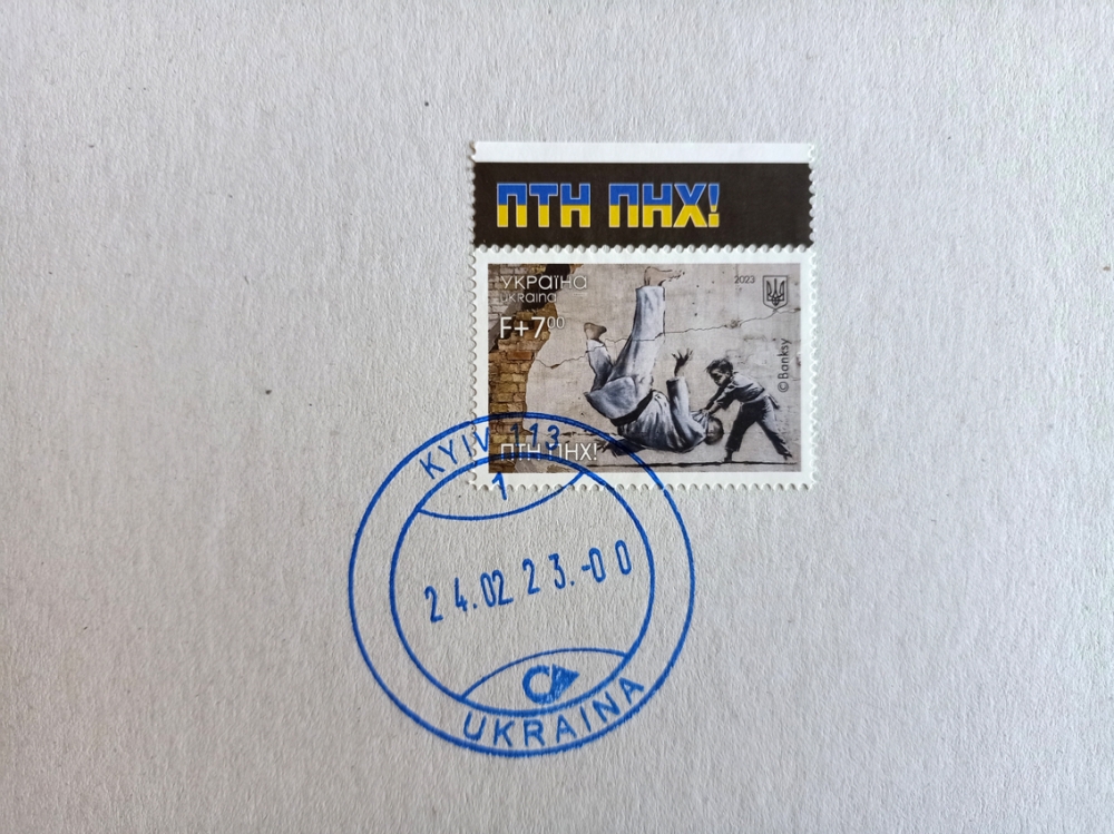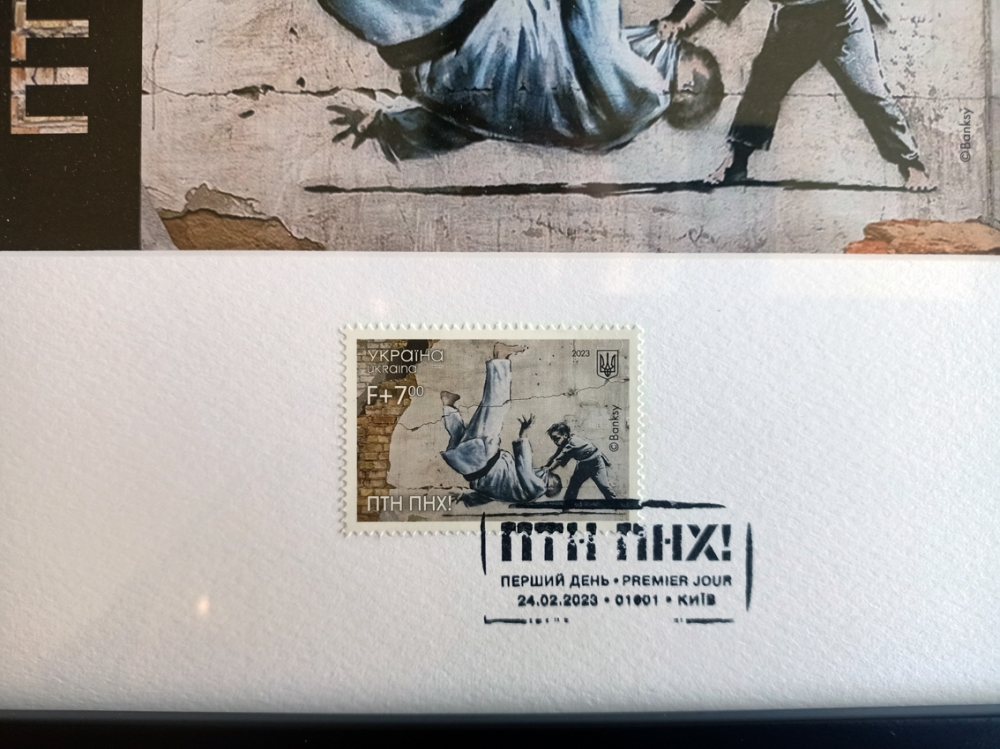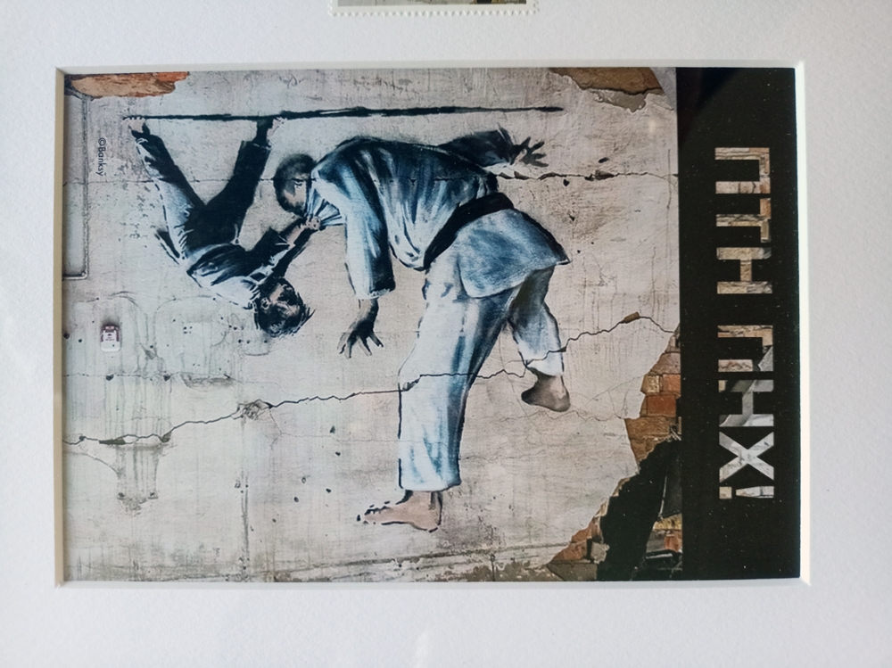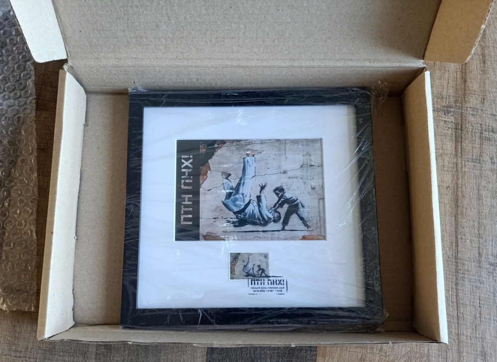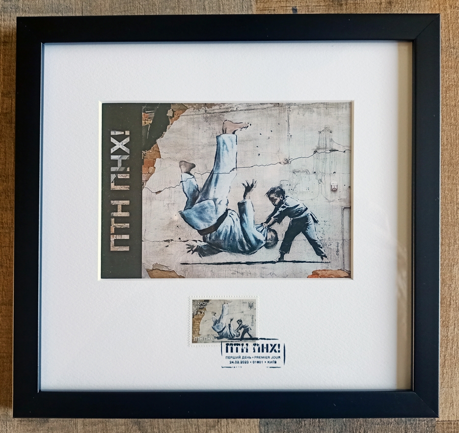 Ukrposhta Ukraine War Postcard PTN PNH! LE w/Stamp - w/Receipt 2023 (Banksy Attributed) SOLD OUT (#0643) Offcial Limited Edition, 1000 pieces, War Postcard and Stamp in Frame PTN PNH with First Day Cancellation "Putin Go FCK Yourself Banksy Graffiti" Ukrposhta Ukraine 2023. Original by UkrPoshta. Limited quantity is available. Size:Framed 24x22cm. The cash receipt will be included. Limited edition War Postcard and Stamp in Frame made in support of Ukraine depicting a Banksy mural. There are only 1000 pieces of this exclusive framed souvenir set that were released by Ukraine's National Post. SOLD OUT!! Brand new! History behind this stamp On the 24th of February, putin declared so-called "special military operation in Ukraine". It was not an easy task to convey the mood of that date. But, it seems, with the art of the famous artist Banksy, which he left on the ruins of a building in Borodyanka, we succeeded. And the future - in the person of the boy, will definitely defeat the past, which has settled in the head of the sick dictator and all those who support him. Or, as the President said at the Munich conference last month, David will defeat Goliath. The release issued on the anniversary of russia's full-scale invasion of Ukraine, presents one of the seven graffiti of the British artist Banksy, created by him in Ukraine in 2022. The graffiti with a judoka who has been sent to the knockout stage was painted by the artist on the wall of a destroyed house in the village of Borodyanka (Kyiv region). White spot(s) in the photo is the reflection of the lens. Photos are part of the description, see pictures to judge by yourself its overall condition. Be safely packaged and sent worldwide.