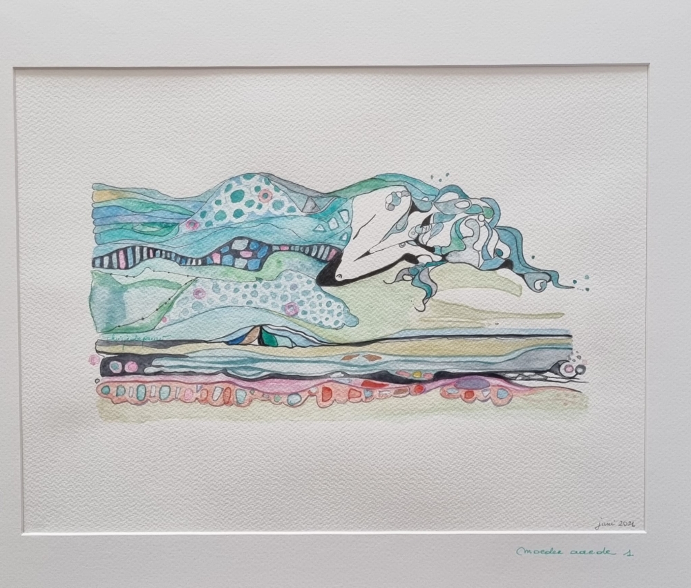 Originele aquarel met als thema vrouw & natuur, getiteld Moeder Aarde. Gesigneerd Het werk ingelijst zonder glas. Chrisje De Pauw is een creatieve duizendpoot uit Burst die zich na een carrière als verpleegkundige zich nu volop uitleeft als kunstenares te Burst, waar ze ook een plek heeft gecreëerd waar mensen elkaar kunnen ontmoeten bij goed glas wijn, taart of tapas. De hamerprijs (geboden bedrag/hoogste bod) wordt integraal geschonken aan ORKA vzw. Alle werken zijn af te halen in Aalst.