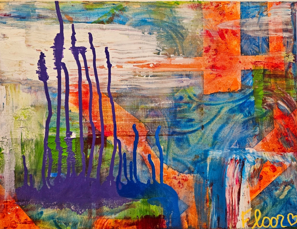 Acryl op doek Origineel werk Gesigneerd "Floor" Gecreëerd tijdens de ORKA ontmoetingsdag "Een dag om in te kaderen" op zaterdag 25 februari in Sint-Martens-Latem. Daar gingen kinderen en jongeren die leven met reuma (en hun broers & zussen) aan de slag met het team van LukiArt (kunst op maat van het zieke kind) om een reeks originele kunstwerken te maken. Een aantal van hen kozen ervoor om de werken in te brengen in deze veiling om de werking van Orka vzw te steunen.