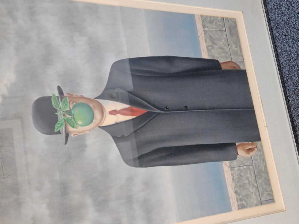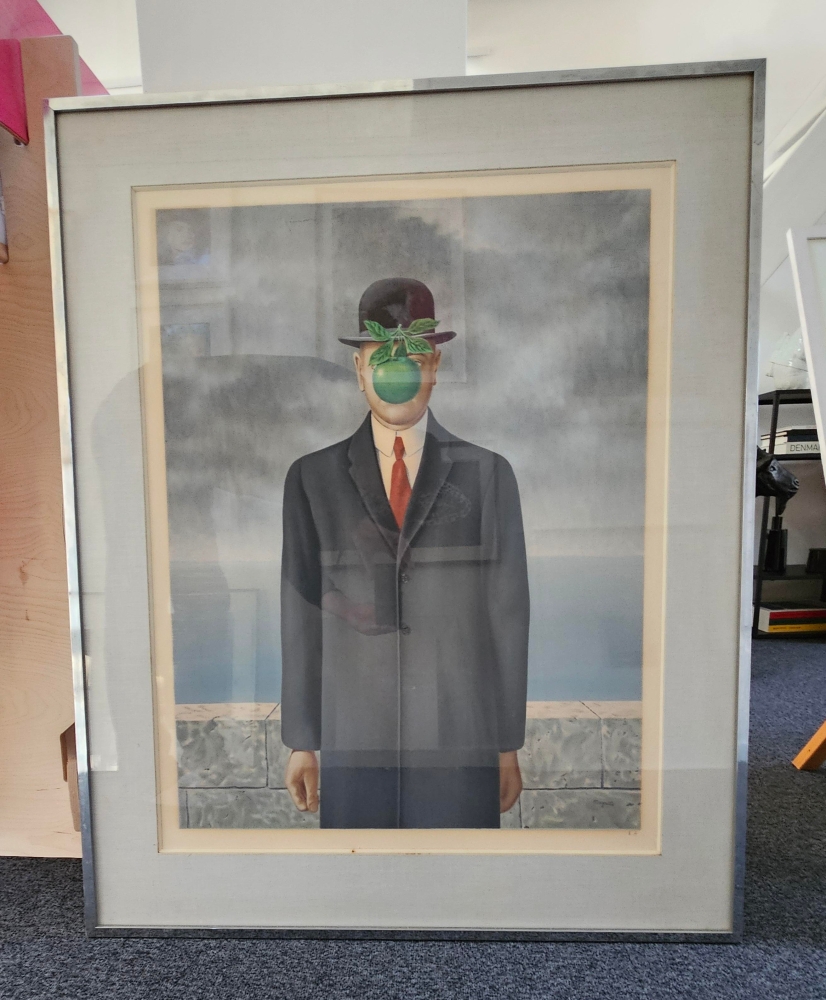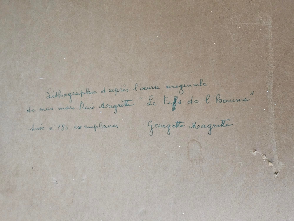 Zeer typisch werk van Rene Magritte, getiteld "Le fils de l'homme" Er circuleren diverse formaten en edities van dit werk. Dit is een zelfzaam groot werk op een beperkte editie van 150 ex. en bekomen via de weduwe van de kunstenaar. Zij (Georgette Magritte) heeft ook op de achterzijde van dit werk een nota gemaakt en gesigneerd (COA), zie ook de foto's Het werk is ingelijst