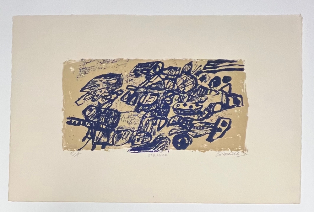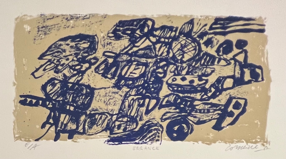 An abstraction by Corneille is never quite an abstraction, but often tells the story of a moment in the painter's life. Here, "Errance" is an impression of a Mediterranean landscape, where vegetation and minerals merge. Corneille travelled regularly to southern Spain between 1960 and 1964. Rare original lithograph titled, signed and dated in graphite at bottom, with reference in the Donkersloot catalogue raisonné n°125. Artist's copy with Corneille's studio stamp on reverse. Overall dimensions: 37 x 56 cm, on Arches paper. Michel Cassé hand press. Commercial edition of 80 copies made for the US market (Lefebre Gallery, New York).
