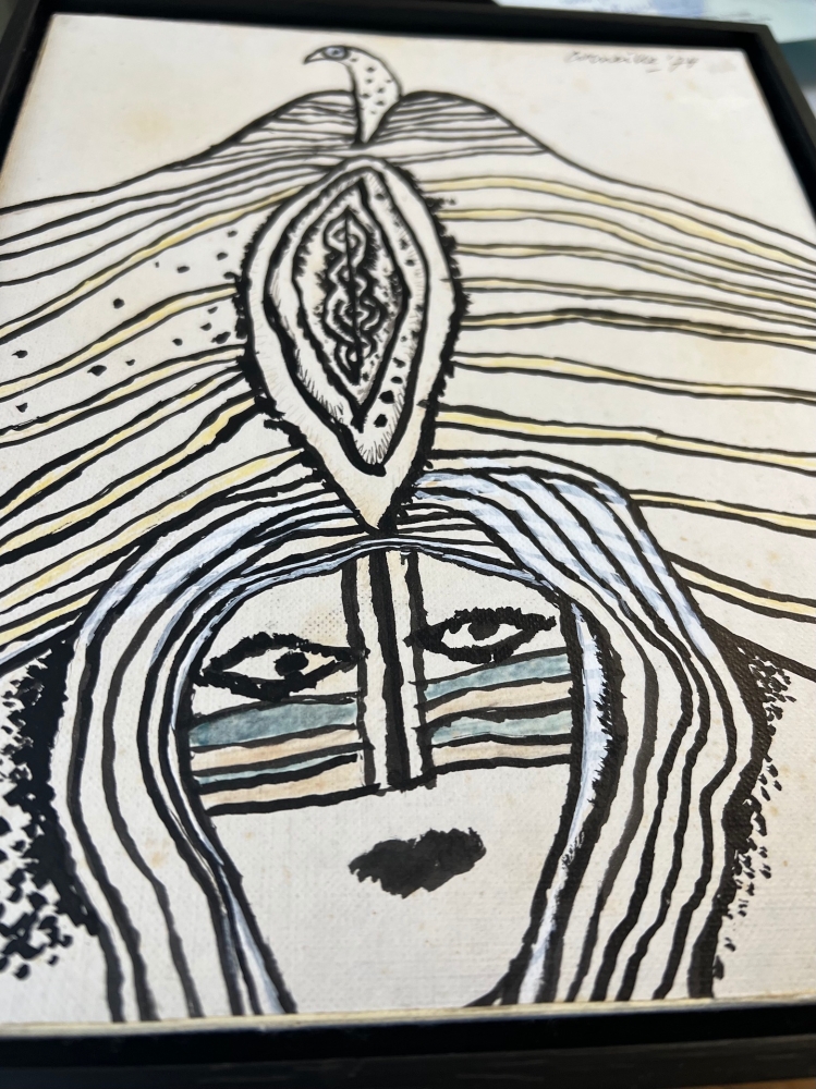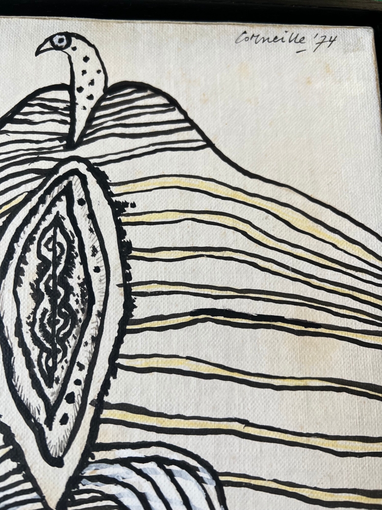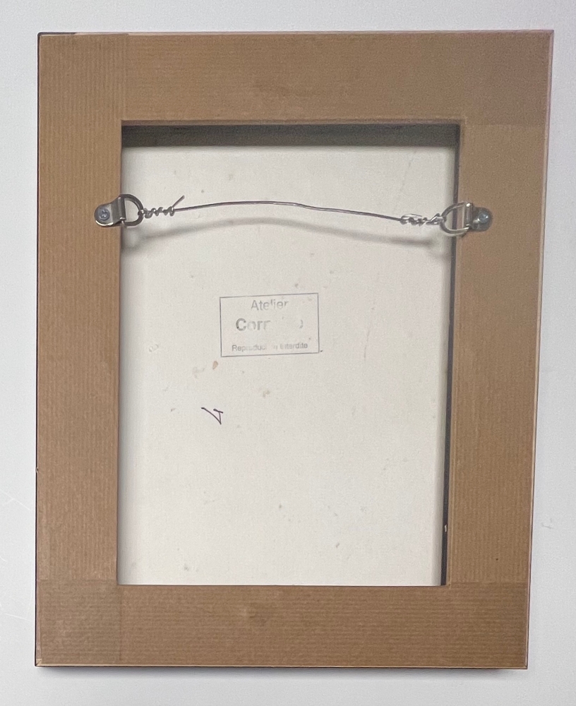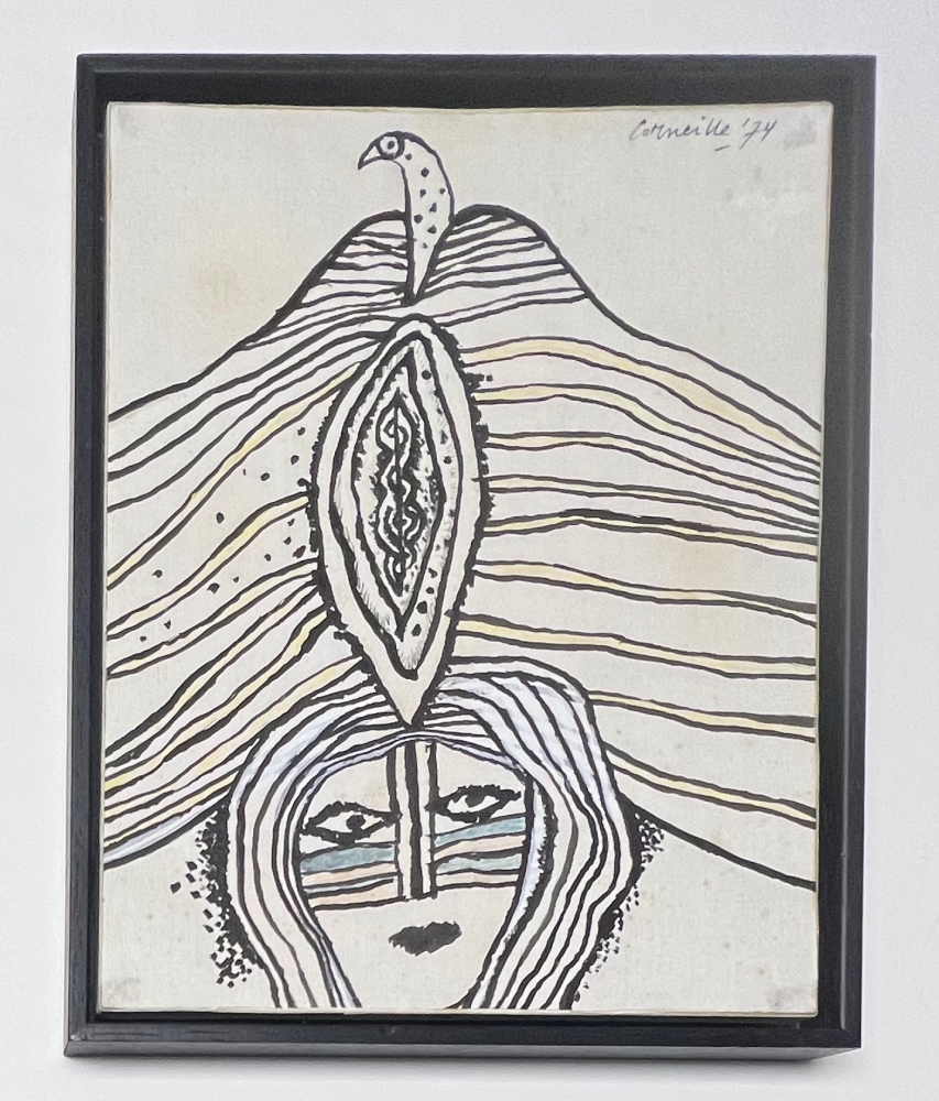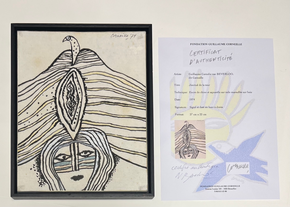 Totem-woman or woman, matrix of the world, is an intriguing work in which the made-up face seems to be protected by a mountain or topped by a headdress of birds with outstretched wings (a recurring theme in her work). India ink and watercolour on canvas mounted on wood by painter Guillaume Corneille, founding member of the Cobra group Original work signed and dated top right, created for the book Journal de la Tour published in 1975 Dimensions: 27 x 22 cm. Size with frame: 29.8 x 24 cm. Yellowing spots on the canvas due to age. Issued with a certificate of authenticity from the Fondation Guillaume Corneille