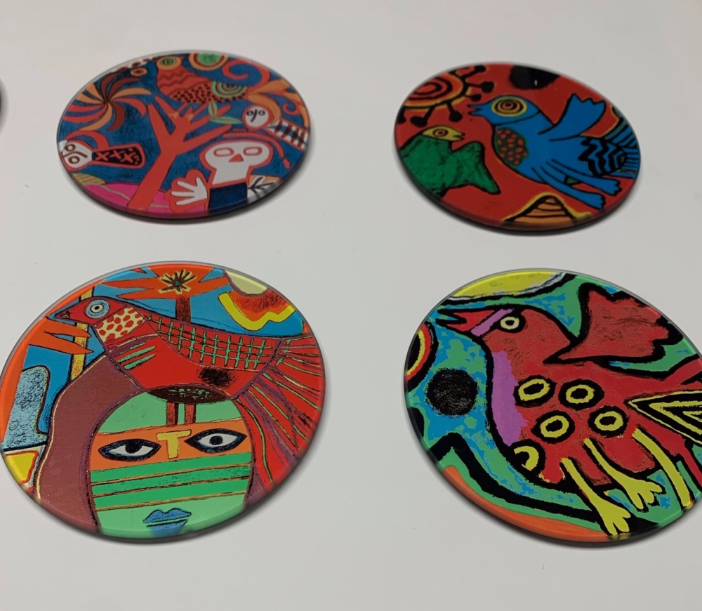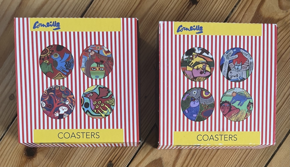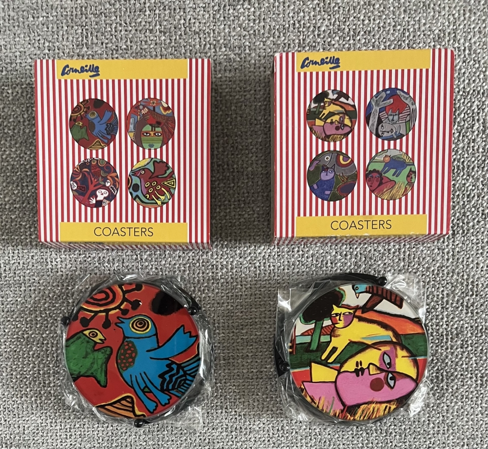 Lot includes: - 4 Cats coasters - 4 Birds coasters Dimensions: 10 cm in circumference. Non-slip supports on each coaster. Two metal storage pieces. Perfect condition. Guillaume Corneille (1922-2010), born in Liège of Dutch parents, was a founding member of the Cobra group (contraction of Copenhagen, Brussels, Amsterdam) that included Karel Appel, Christian Dotremont, Asger Jorn, Constant, and then Alechinsky.