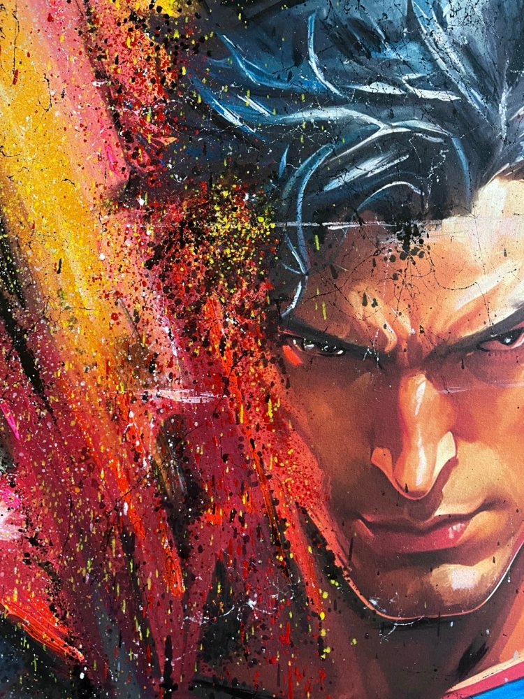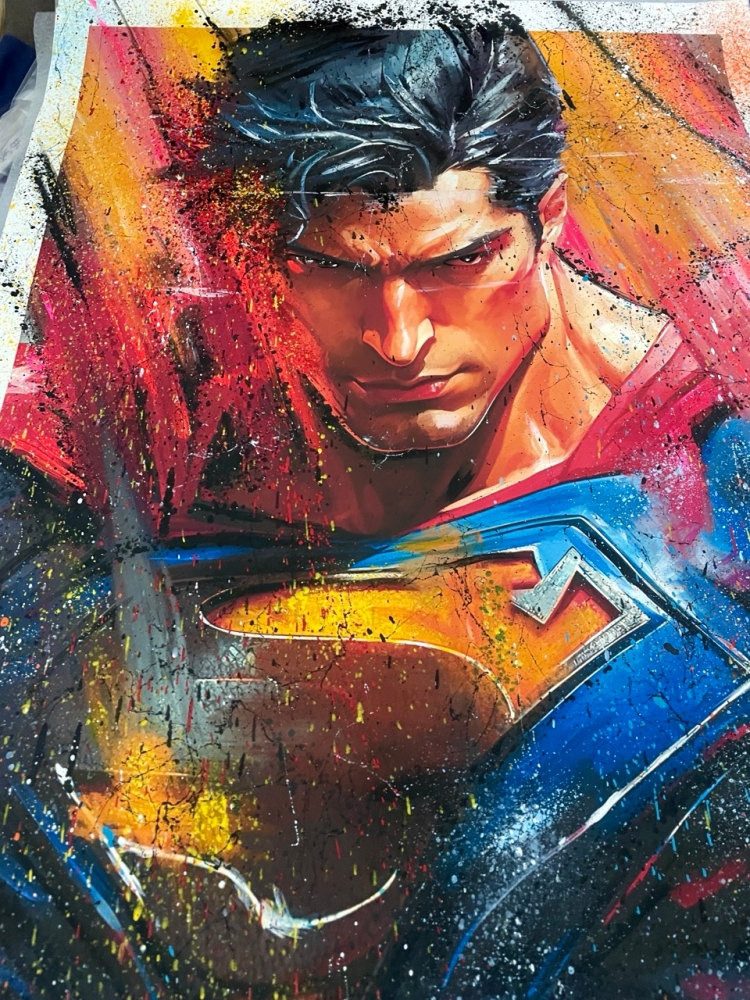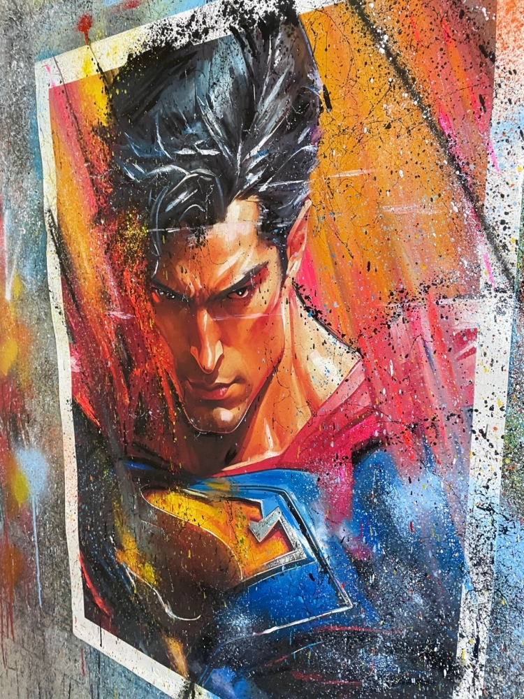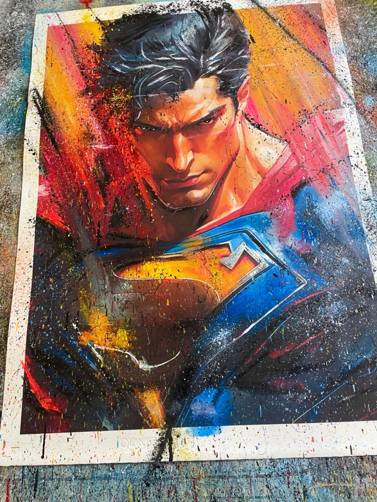 "Superman" Presenting a remarkable rendition of Oliver's artwork: "Superman" this exclusive edition exemplifies the artist's exceptional talent and boundless creativity. This is a original, one of a kind piece, it's a mixed media artwork (spray on Paper, gliceé, acrylic on paper) Oliver, a passionate artist residing in Portugal, discovered his deep-seated love for Urban art and Illustration from a tender age. Over the years, his artistic journey has unfurled, expanding his skills into various creative realms, including concept art, 3D renders and digital masterpieces to captivating canvases and mixed media artworks.
