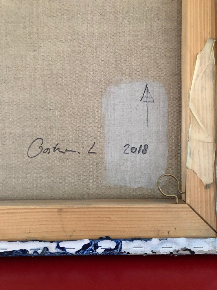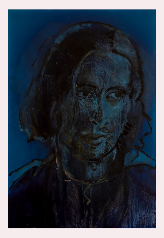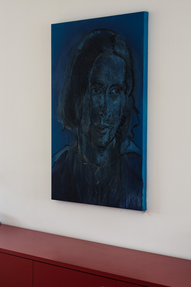 Het is een groot portret van een man. afmeting 120 x 80 cm , De structuur speelt een belangrijke rol voor de sfeer en ook dat de zijkant een andere kleur blauw heeft. In mijn ogen een sterk portret met ingetogen uitstraling. Prettig beeld om naar te kijken. Meer wer van Lambert Oostrum is te vinden op: www.lambertoostrum.nl