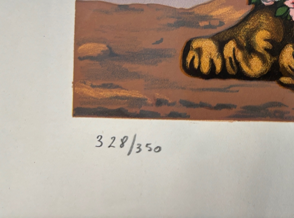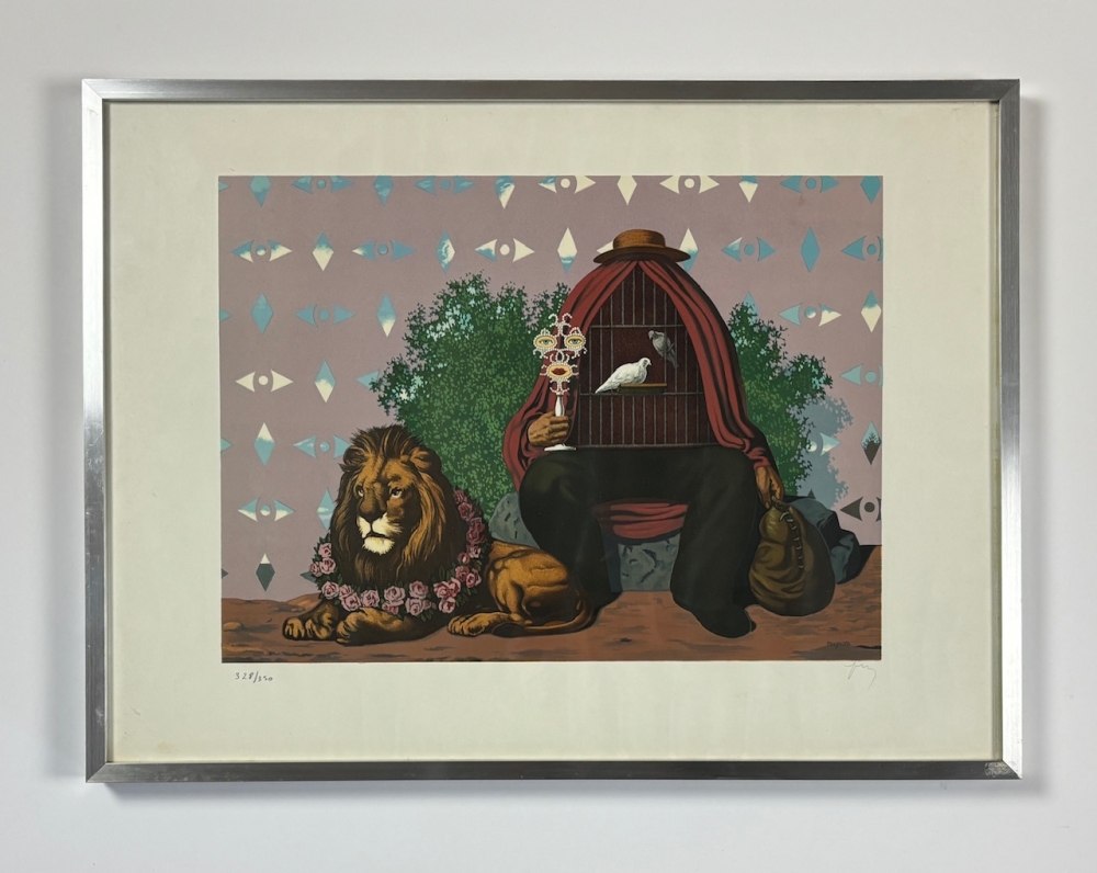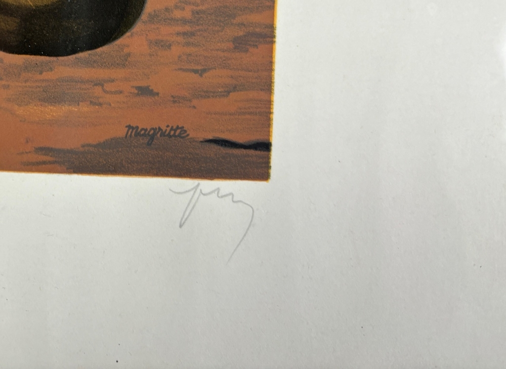 Lithografie ‘Deux Tourterelles, dans la Chaude Pénombre de Leur Maison’ uit 1968 door René Magritte. Uitgave gerealiseerd door Fernand Mourlot in een oplage van 350 exemplaren. Gesigneerd rechts onder door de uitgever en genummerd 328/350 links onder. In kader. Verzekerde verzending alsook ophaling mogelijk.