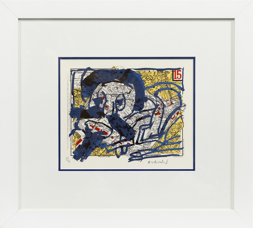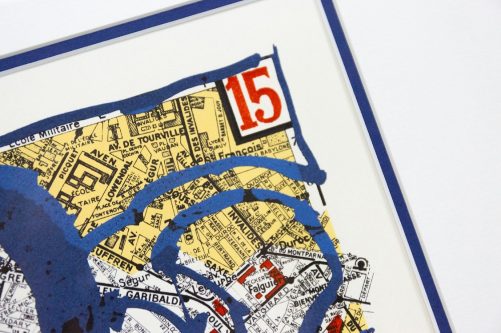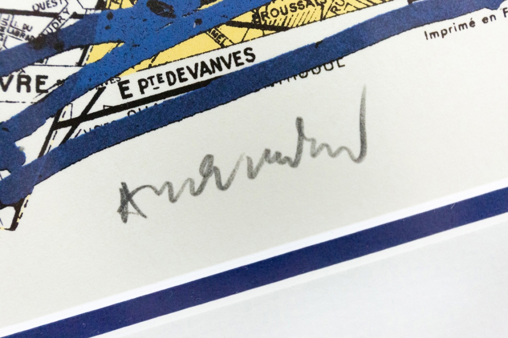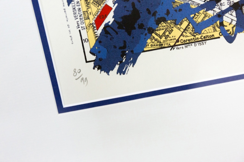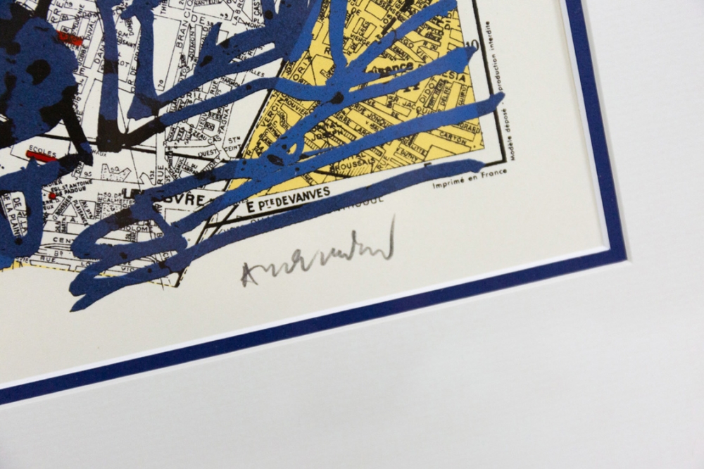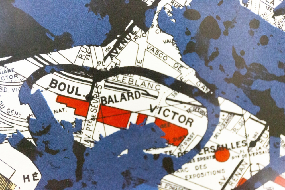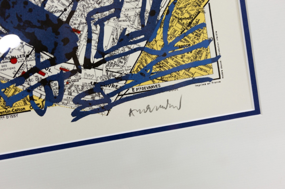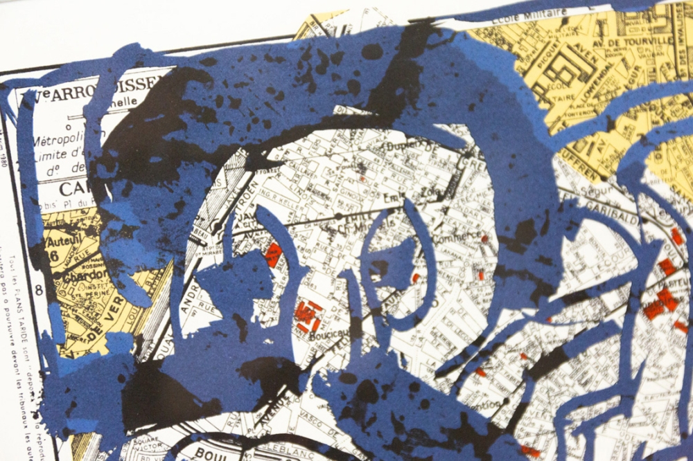 Een lithografie van Pierre Alechinsky op een kaart van het 15e arrondissement van Parijs uit 1980.