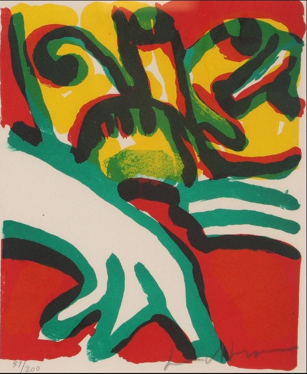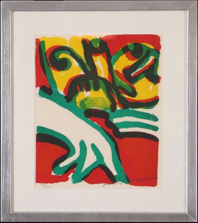 beautiful old lithograph in 3 colors by the Swedish artist Bengt Lindström in his characteristic style of different colors and often with distorted faces. Lindström was influenced by the paintings of COBRA artist Karel Appel. Framed in a basic frame but can perfectly be hung on the wall