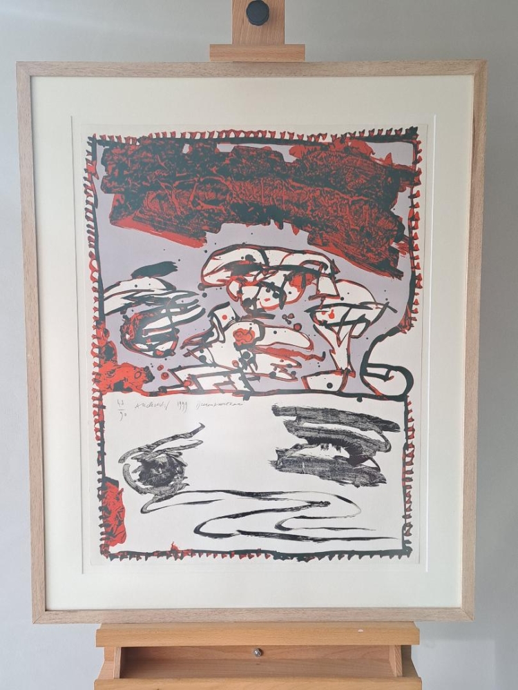Published by Ronny Van de Velde Gallery, Antwerp on the occasion of the exhibition of Pierre Alechinsky No. 47/90 work is floatingly framed in a natural wooden frame. Both work and frame are in perfect condition.