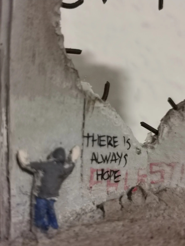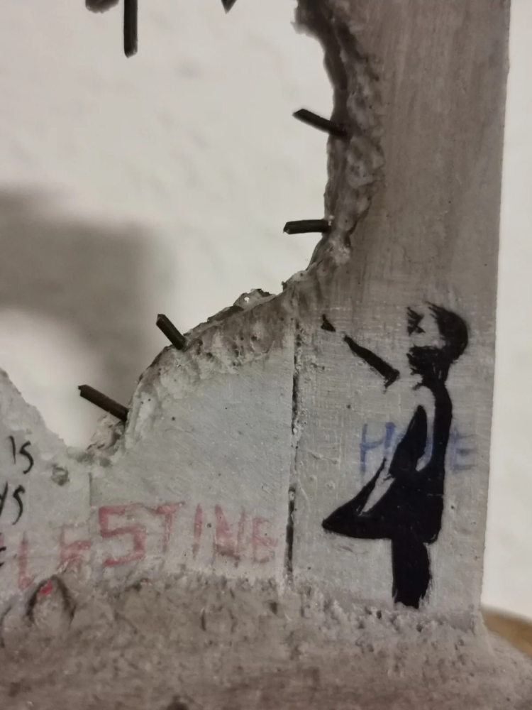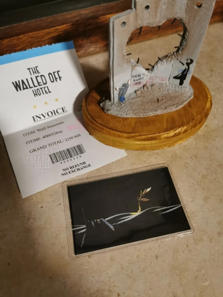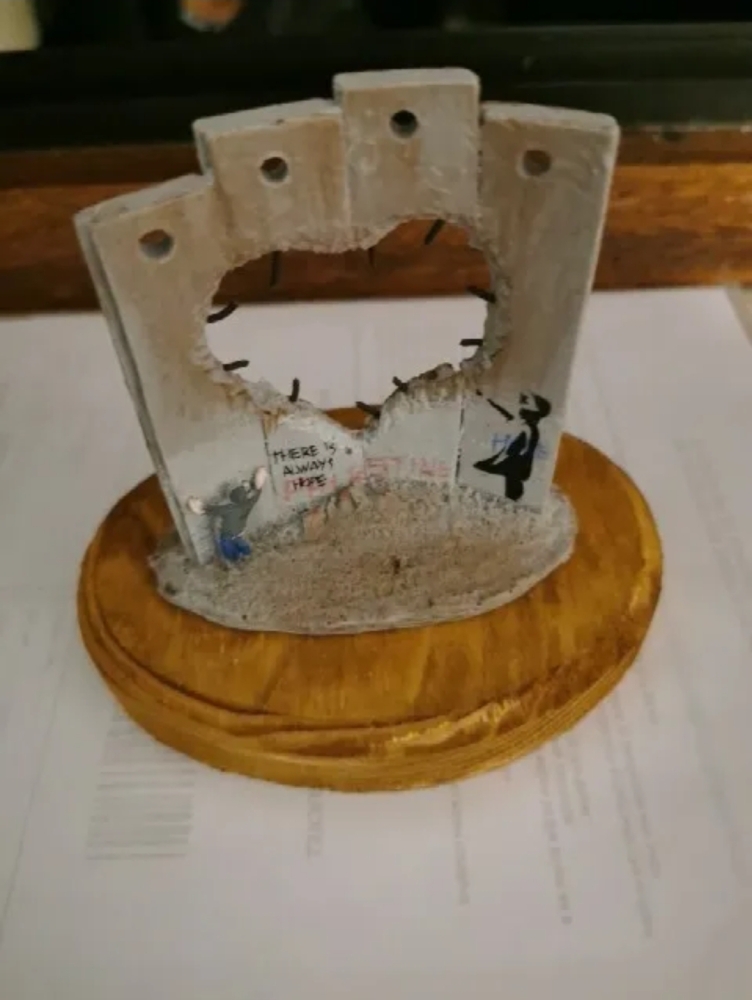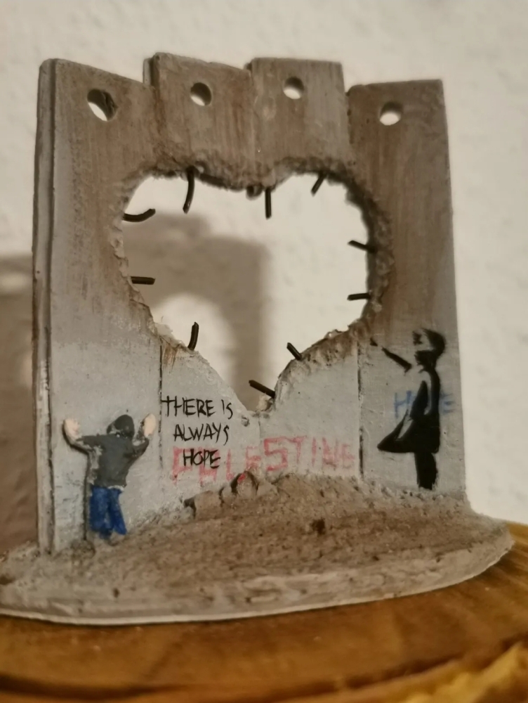 Origineel rechtstreeks uit "The Walled Off Hotel" met origineel ontvangstbewijs uit het Heilige Land, Palestina, Bethlehem. Alleen te koop in de hotelwinkel. Het materiaal dat is gebruikt voor het maken van dit Banksy Heart Defeated Wall-gedeelte is een litho met beton en geschilderde giethars met beton. Ter overweging: dit figuur is een uiterst zeldzaam verslagen muurgedeelte, exclusief gemaakt voor het Walled Off Hotel door Banksy, Gemaakt van polymeer giethars, met de hand beschilderd met figuur Dit multiple is een miniatuurreproductie van de Palestijnse scheidingsmuur, exclusief uitgegeven door Banksys The Walled Off Hotel in Bethlehem (Palestina). De vormen zijn door Banksy zelf gemaakt en vervaardigd in beperkte oplage in Engeland. De graffiti werd onder het gezag en auspiciën van Banksy aangebracht door Palestijnse kunstenaars. Elk van de objecten is uniek, omdat ze met de hand zijn beschilderd en elk verschillende details en inscripties bevatten. Banksy opende dit hotel in Palestina en kijkt uit over de Wall of Separation, het slechtste uitzicht ter wereld.