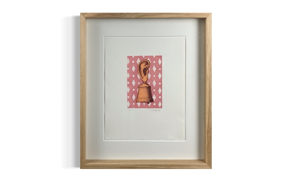 Original engraving by René Magritte from 1968 on Vélin de Rives paper. The engraving has been signed with the stamp and also bears an embossed stamp 'Atelier René Magritte, original engraving' at the bottom. Professionally framed. 282 x 232 mm (Etching) 420 x 370 mm (frame) Insured shipping and pick-up possible.