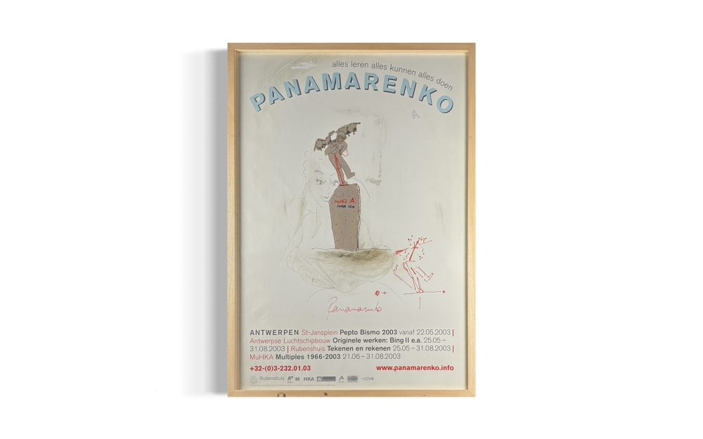 Hand gesigneerde affiche door Panamarenko. De iconische affiche werd gemaakt in 2003 naar aanleiding van een reeks tentoonstellingen in Antwerpen. Professioneel ingelijst en op zeer groot formaat. Enkel ophaling of levering binnen België mogelijk.