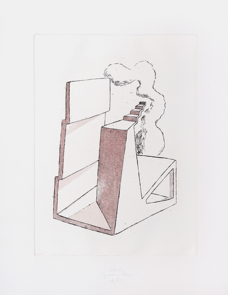 Suite van 7 etsen in een linnen map, inclusief titelpagina en colofon Afmetingen blad: 41 x 31 cm Afmetingen beeld: 25 × 20 cm (A,D); 24 × 18 cm (B,C,F,G); 30 × 22 cm (E) Oplage van 15 + 4 AP Uitgave 2016 LUnivers des Formes is een suite van 7 etsen, gerealiseerd in een combinatie van ets en aquatint. In deze reeks verdiept kunstenaar Philip Aguirre y Otegui zich in de vormentaal die zijn oeuvre kenmerkt. De etsen verwijzen dan ook rechtstreeks naar zijn beeldhouwwerken en architecturale sculpturen, zoals bijvoorbeeld zijn Théâtre Source in Kameroen. De reeks vangt aan met abstracte, bijna surrealistische vormen, maar geleidelijk herkent men elementen uit de reële wereld - in de laatste ets zijn zelfs enkele menselijke figuren te zien. De invloed van Giorgio de Chirico en René Magritte is voelbaar.