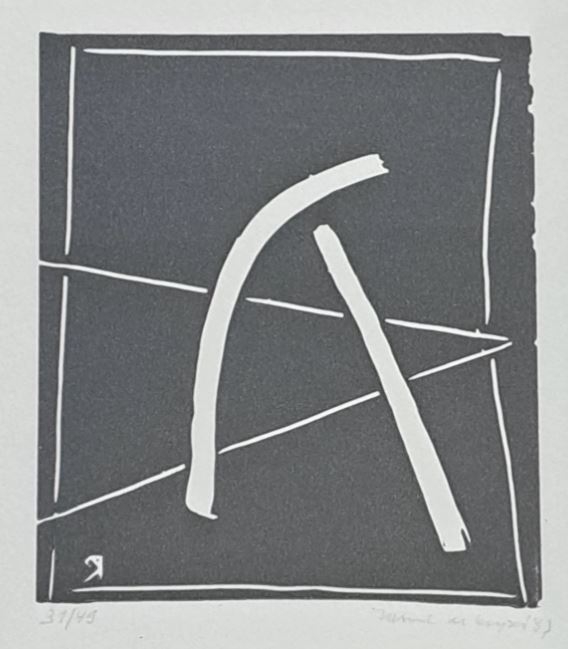 Monogram as part of the print. Signed, numbered and dated in pencil. This lino, which appears to be a mirrored version of the painting Six for P. (1985), which was later transformed into Komst (1985/95), was published on the occasion of the Raoul De Keyser exhibition in the exhibition space of the Association for the Museum of Contemporary Art in Ghent (March 27 to April 25, 1987) professionally framed in a natural wooden frame with UV-resistant glass
