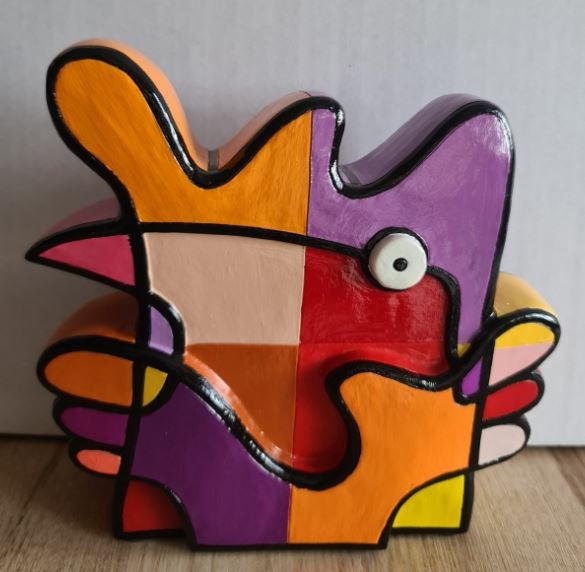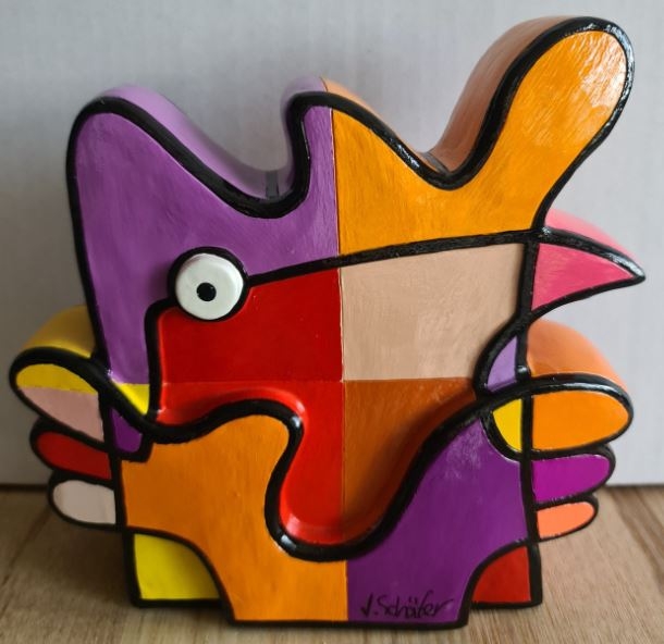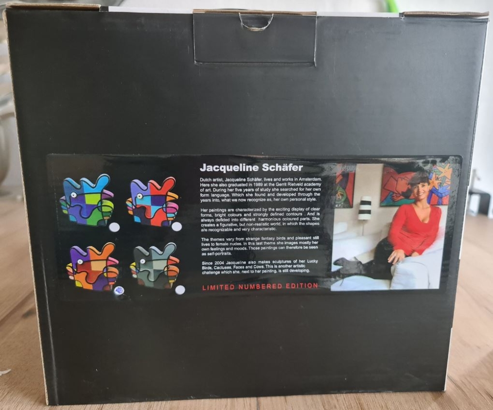 Mooi kunstobject van kunstenaresse Jacqueline Schäfer! De serie kunstobjecten bestaan uit bonte kleuren en van elke kleur zijn er maar 200 exemplaren vervaardigd. De Vreemde Vogels zijn gemaakt van hoogwaardige kunsthars en hebben een afmeting van 19 x 19 cm. De kunstobjecten zijn uiteraard met de hand gesigneerd.. Inclusief originele bijhorende zwarte verpakking met bijkomende uitleg.
