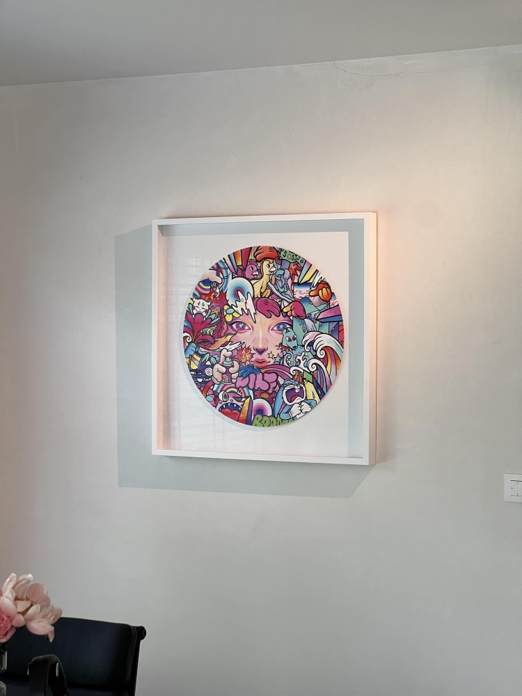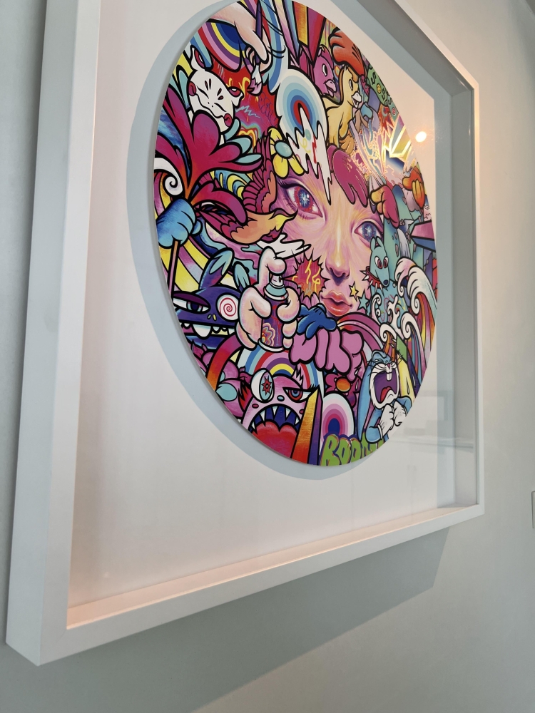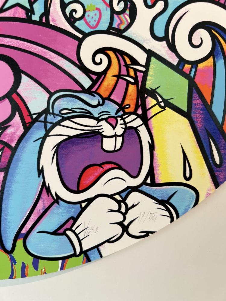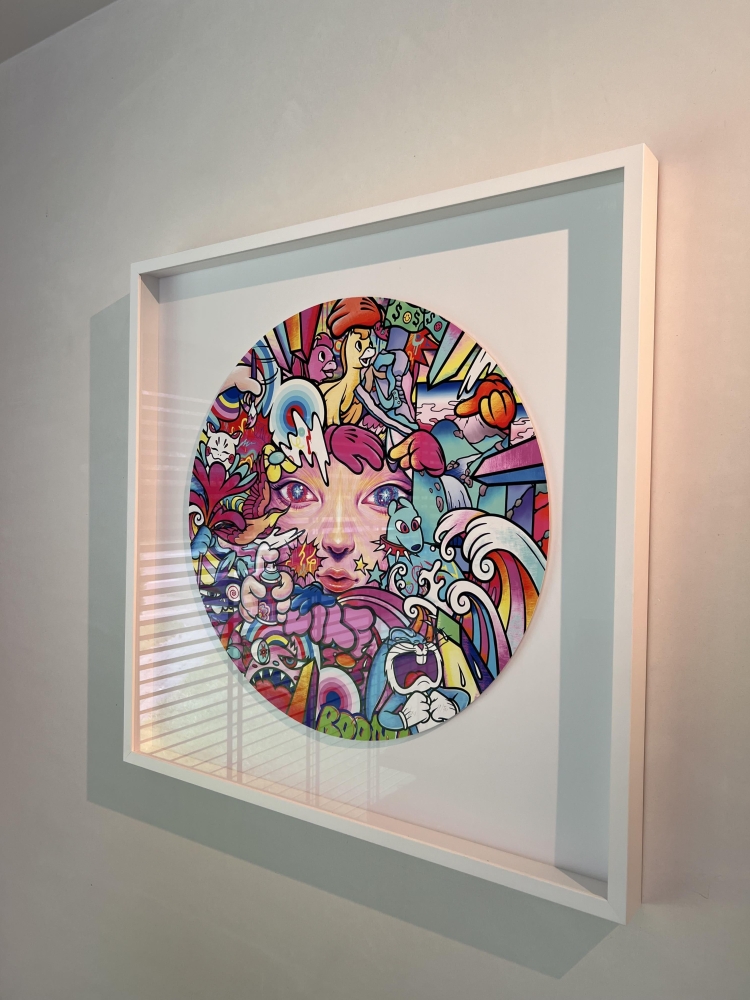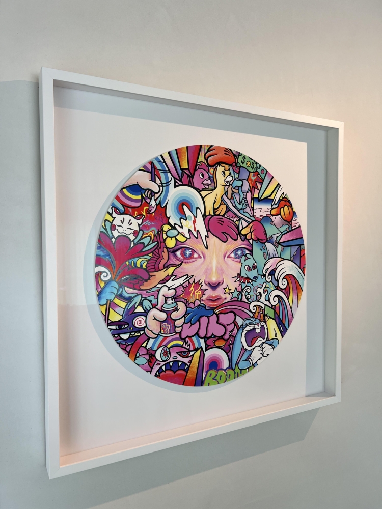 Dark Side Of The Rainbow is een limited edition zeefdruk van 44 stuks. Print werd verkocht aan 10.000 USD, zeer zeldzaam gezien beloning voor NFT eigenaars van dit werk. Hier wordt het exemplaar 19/44 verkocht, dewelke met de hand gesigneerd is door VEXX. Ingelijst met ontspiegeld glas 2mm 70% UV, rond werk - zwevend in kastkader. (professioneel door ArtFrameCenter Brugge)