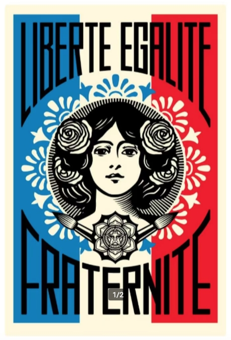 FREEDOM EQUALITY FRATERNITY, een emblematisch werk van het werk van Shepard Fairey, bekend als OBEY Handgesigneerd werk 91 x 61 cm Uitgave op Fine Art-papier Niet ingelijst In perfecte staat Het werk is rechtsonder met potlood gesigneerd en gedateerd door de kunstenaar. "Ik heb het stuk Liberté, Egalité, Fraternité gemaakt om mijn steun aan Frankrijk te tonen na de terroristische aanslagen van 13 november 2015, die plaatsvonden vlak voor de installatie van Earth Crisis op de Eiffeltoren. Het stuk was voor mij erg belangrijk als symbool van eenheid in een donkere en tragische tijd. Shepard FAIREY (OBEY).