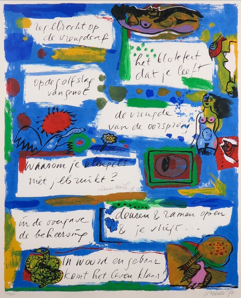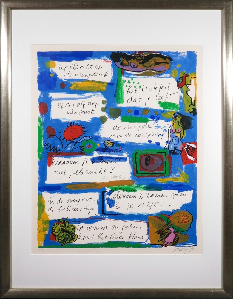 mooie ingelijste litho van Corneille. Met de hand gesigneerd in potlood. Het werk is op 250 exemplaren waarvan dit het nummer 240 is. De afmeting van het werk is 80,5 x 63,5cm en ingelijst 115,5 x 86,5cm. Het werk is van 1990