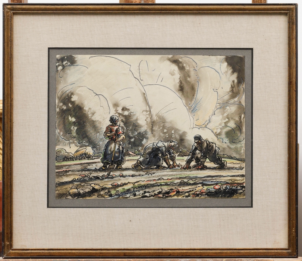 Alfred Ost was een Belgisch kunstschilder die vanaf 1901 het dagelijkse leven tekende en schilderde in Mechelen. Op het veld, 1928. Penseeltekening in Oost-Indische inkt, grijs gewassen, kleurpotlood. Monogram 'AO'. Gedateerd 'XXVIII'. Kader. Afmetingen: 280 x 365 mm (500 x 570 mm)