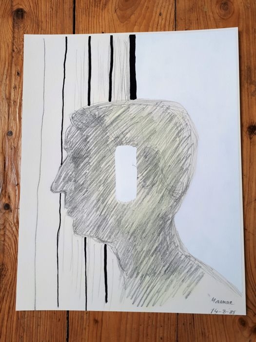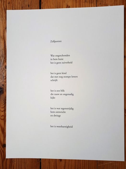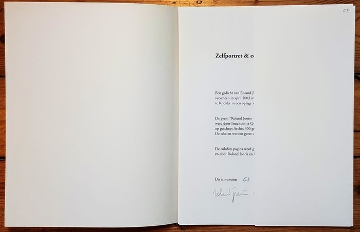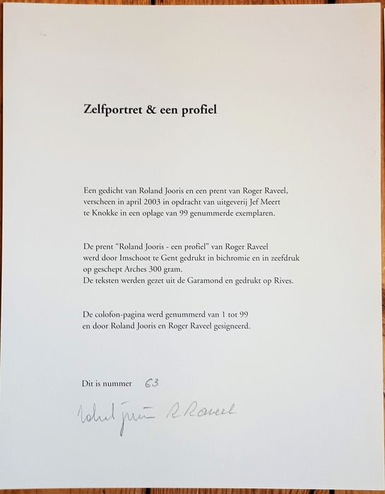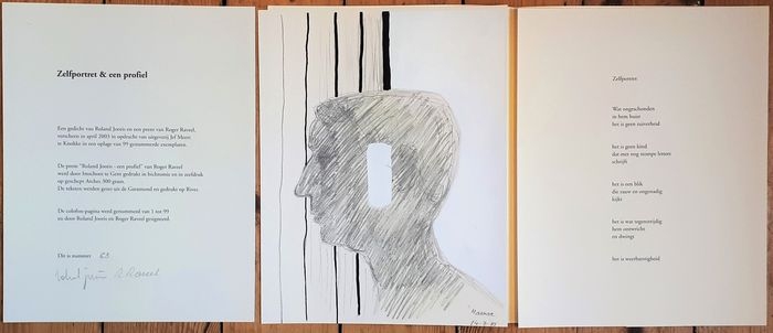 Silkscreen with a self-portrait by Roger Raveel with a poem by Roland Jooris. Edition: 99 copies, numbered and signed by Roger Raveel and Roland Jooris on the Colophon page; This is number 63. Handmade Arches paper.