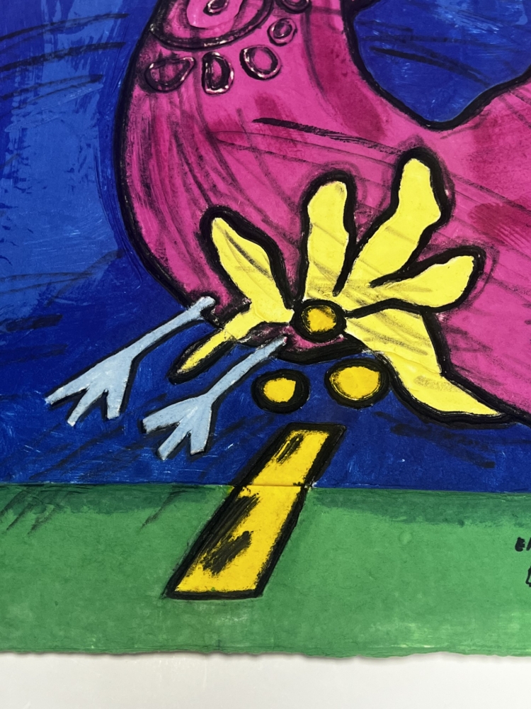 Beautiful aqua gravure signed and dated by the painter at the bottom in ink. Hard to find today. Guillaume Corneille worked on the aquagravure technique for around ten years. This is an entirely traditional technique, where the paper is made and embossed in a large vat. Artist's copy number 1: EA I/XV 50 x75 cm Secure delivery by UPS Guillaume Corneille (1922-2010) was born in Liège of Dutch parents and was a member of the Cobra group along with Constant, Dotremont, Karel Appel, Asger Jorn, Noiret, Doucet and Alechinsky.