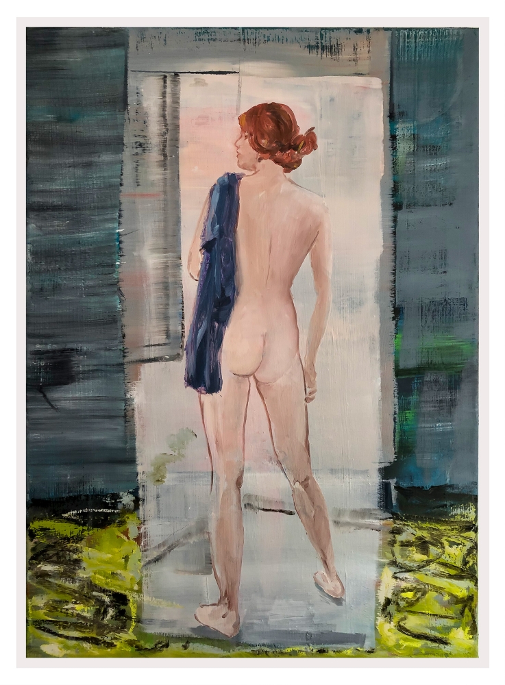 Lady in a room by an open door through which light enters. Lambert Oostrum is still active as a visual artist. At the beginning of his career, he won the Alfons Blomme prize in 1987. Recently Lambert works more abstract with occasional figuration. In 2018 he was nominated for the Herman Krikhaarprijs in Almelo. The painting of the nomination is called: Fresh Product This can be read on his website: www.lambertoostrum.nl