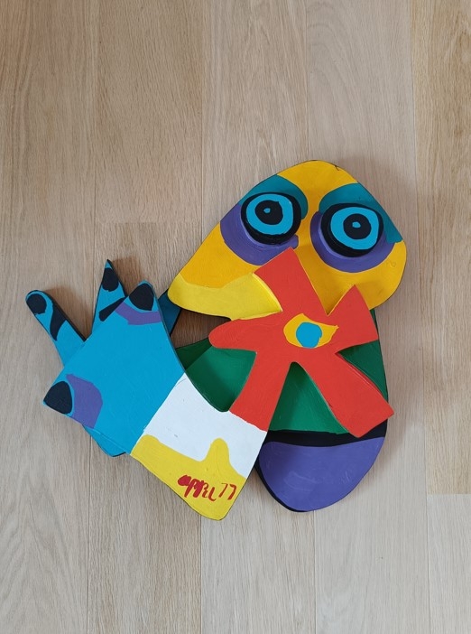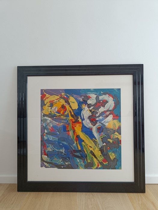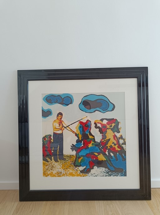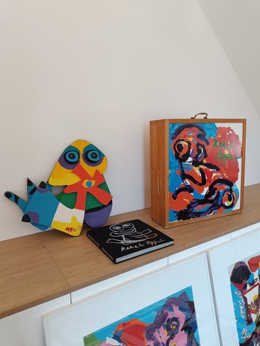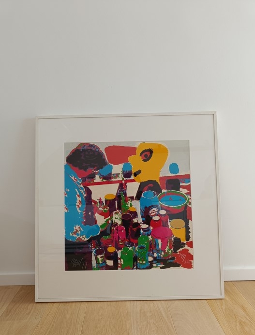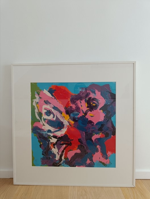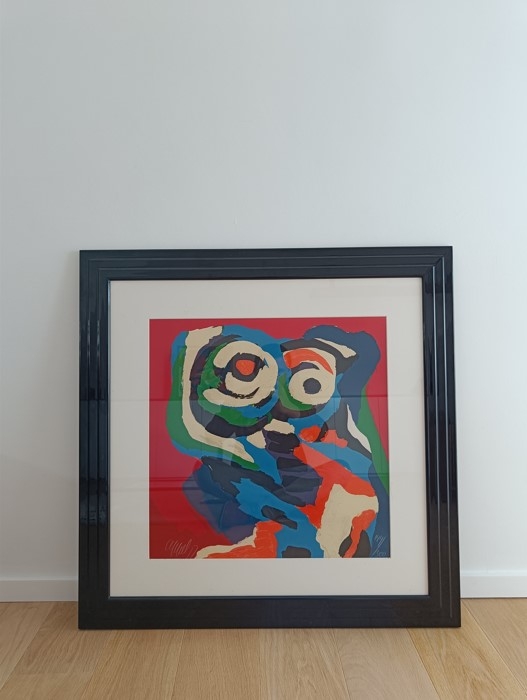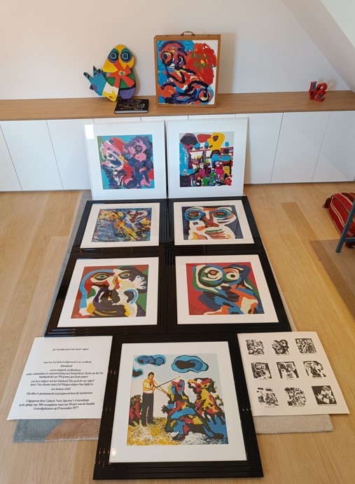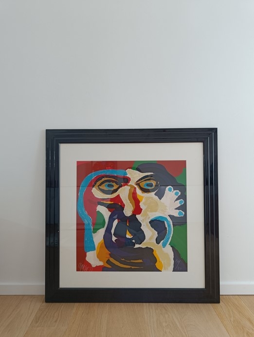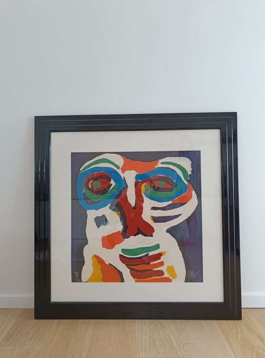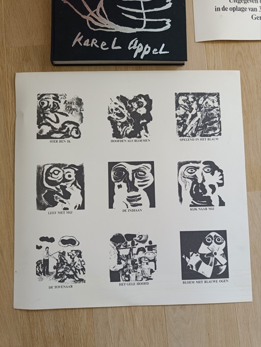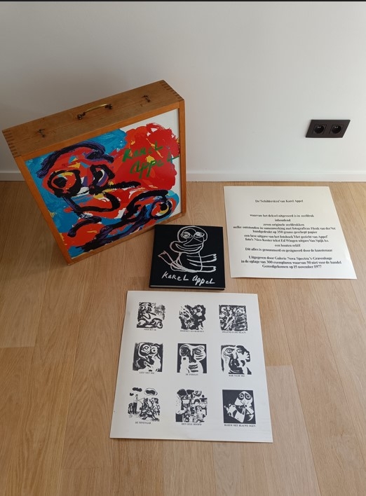 De Schilderskist van Karel Appel: Kijk leef speel met Karel Appel (1977) De houten kist met zeefdrukdeksel, bestaande uit een inhoudsopgave, het gesigneerde fotoboek (Het gezicht van Appel), een in kleuren geschilderd houtreliëf (Bloem met blauwe ogen) en de set van zeven zeefdrukken in kleuren getiteld Hier ben ik, Hoofden als bloemen, Spelend in het blauw, Leef met mij, De indiaan, Kijk naar mij, De tovenaar en Het gele hoofd. Op velijnpapier, iedere zeefdruk is gesigneerd, gedateerd 1977 en genummerd 144/300 (naast de oplage van 300 waren er ook 50 hors commerce exemplaren). Uitgegeven door Galerie Nova Spectra, Den Haag sculptuur hoogte: ca. 47 cm Elke zeefdruk: ca. 50 x 50 cm Doos: 54,2 x 54,2 x 14,5 cm Allen ingekaderd met passe-partout. Sommige inkaderingen dienen wat opgekuist te worden (zie foto's, kleine vlekjes). MAAR iedere zeefdruk is in perfecte staat. Op te halen regio Lier of af te stemmen in provincie Antwerpen