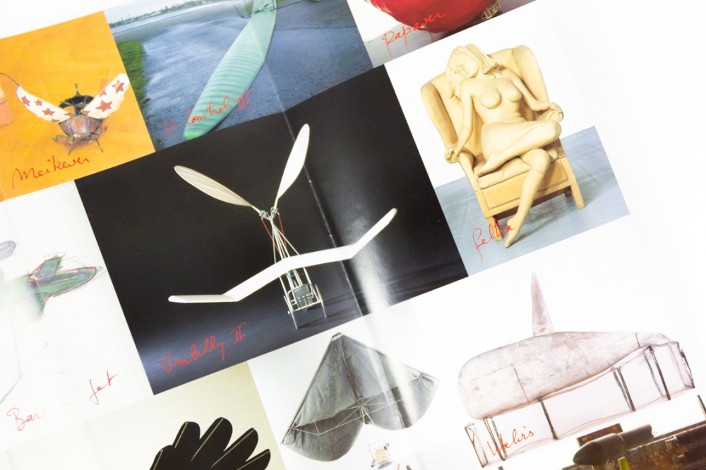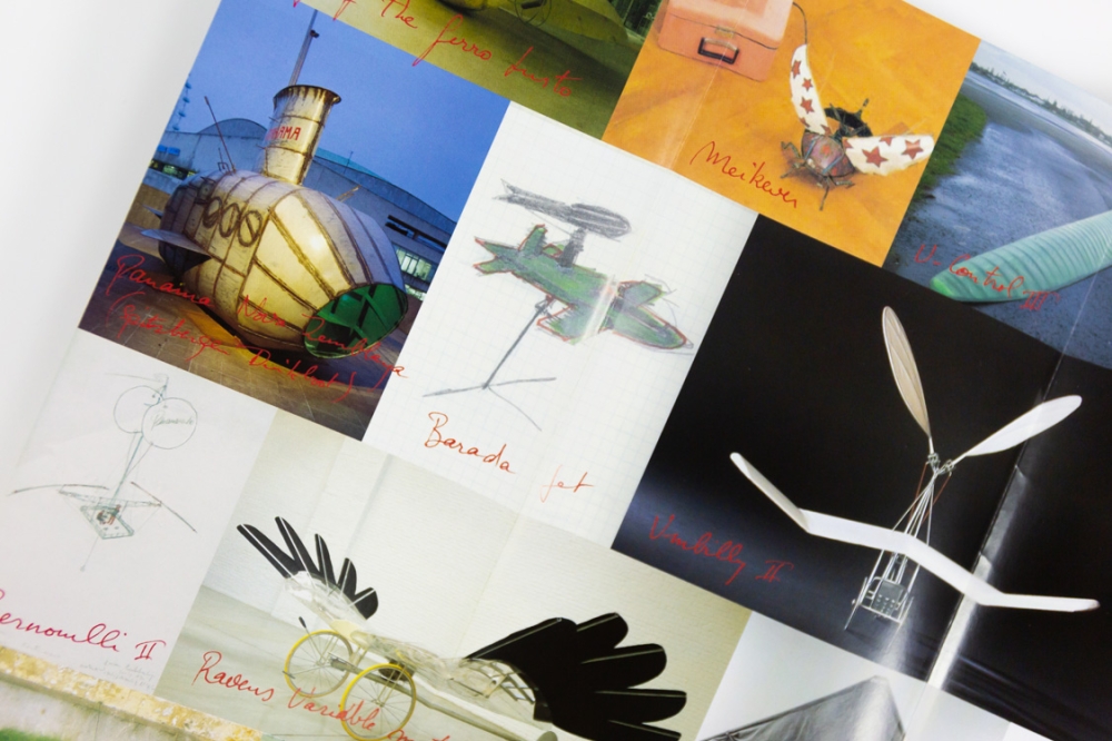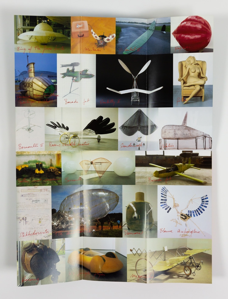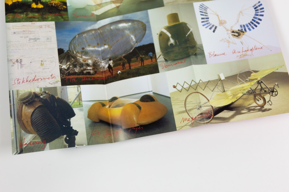 The poster measures 21x10cm when folded and 42x31cm when opened. On the back are ten iconic works by Panamarenko depicted in a kind of mosaic.