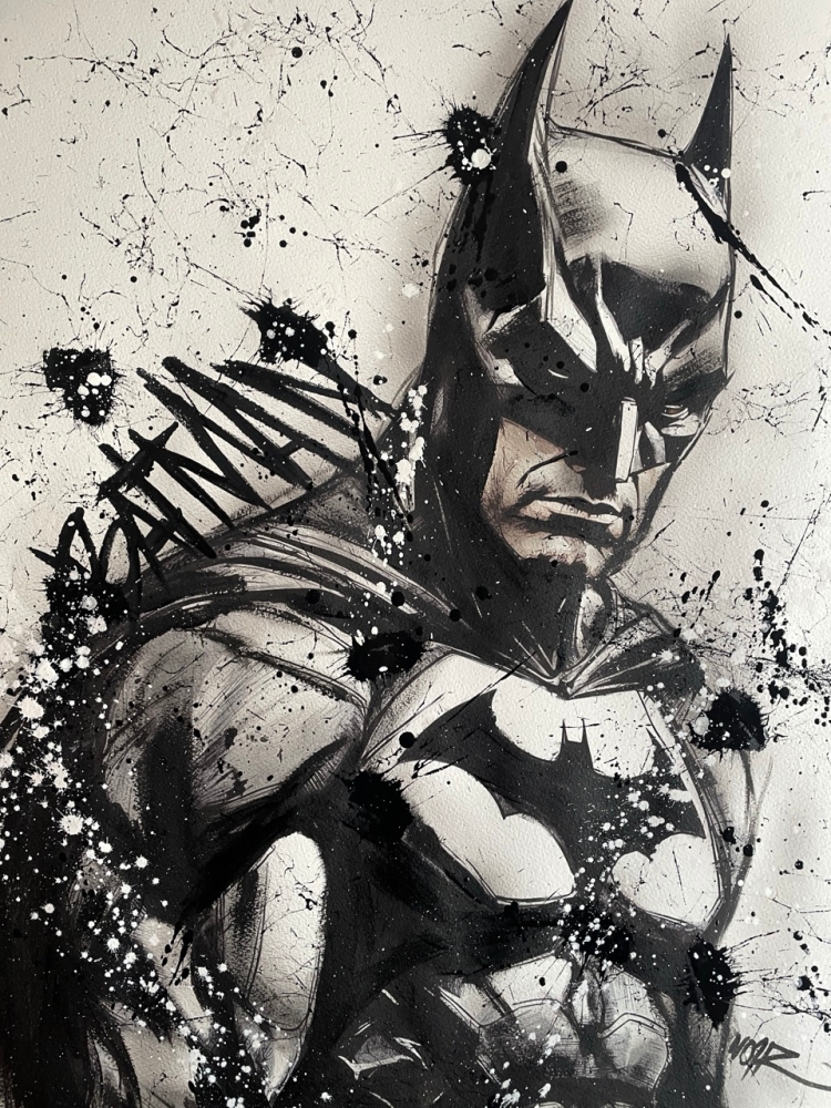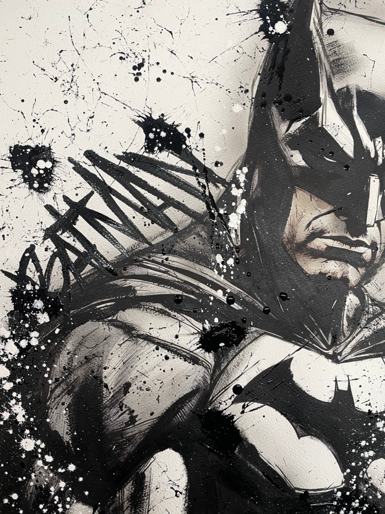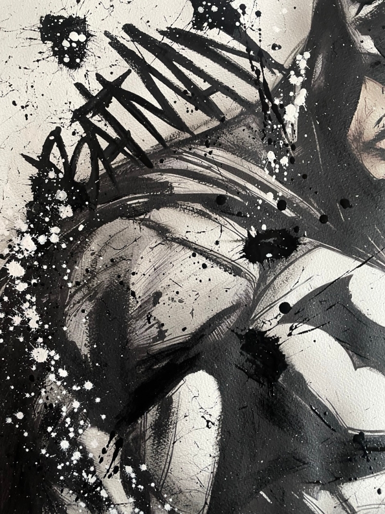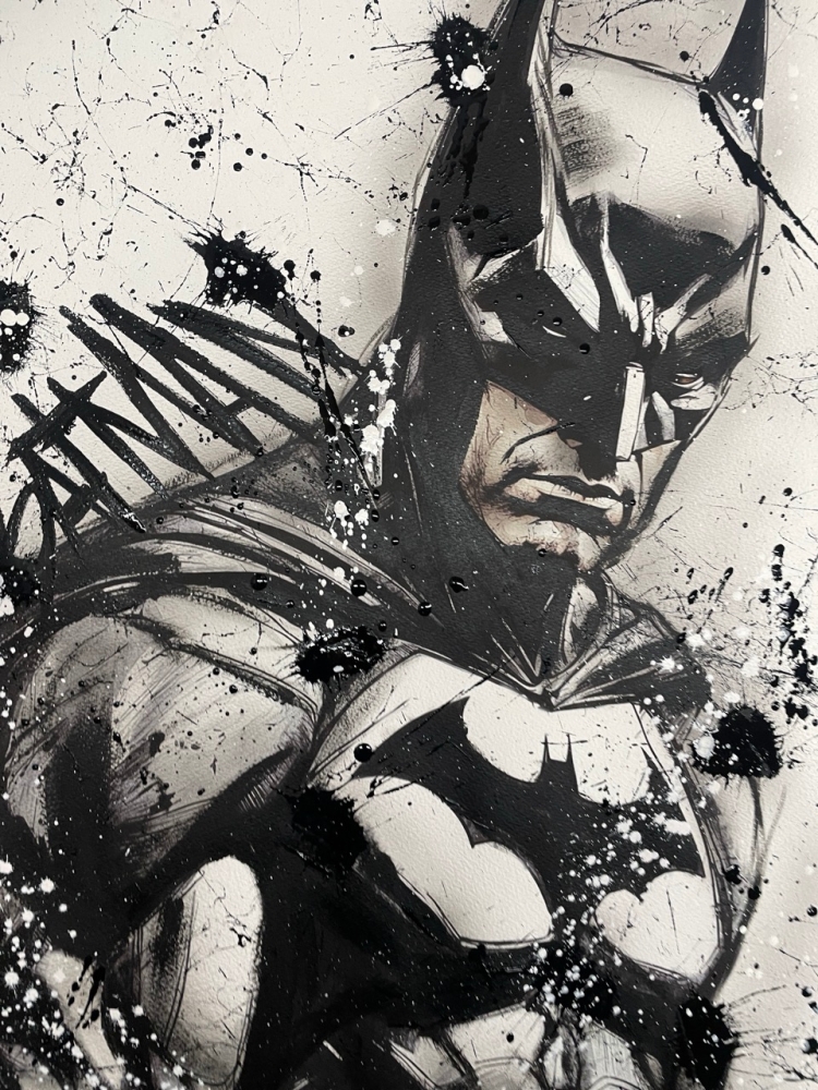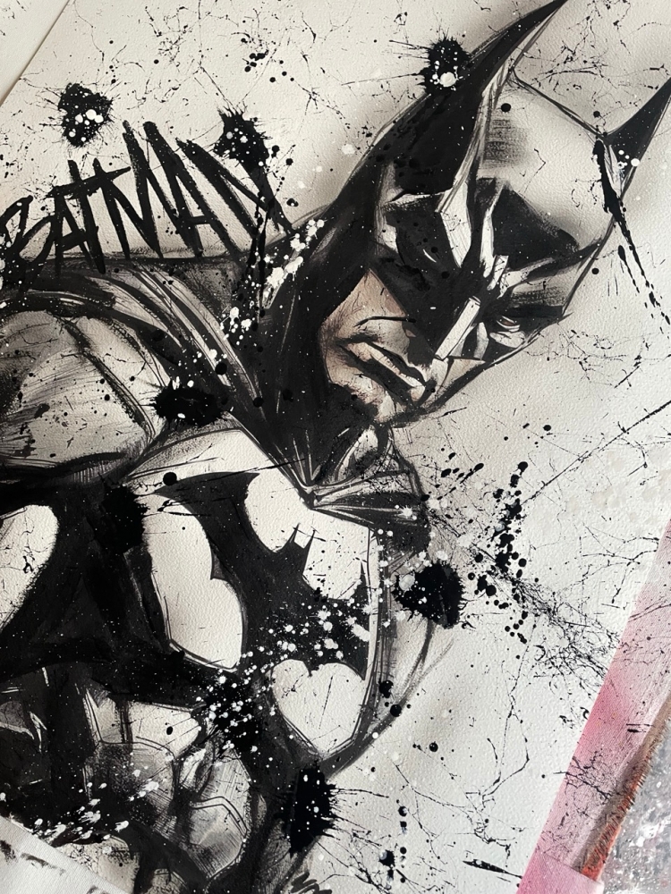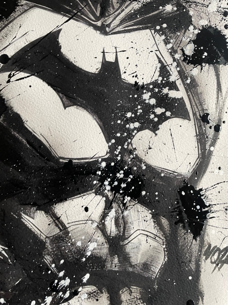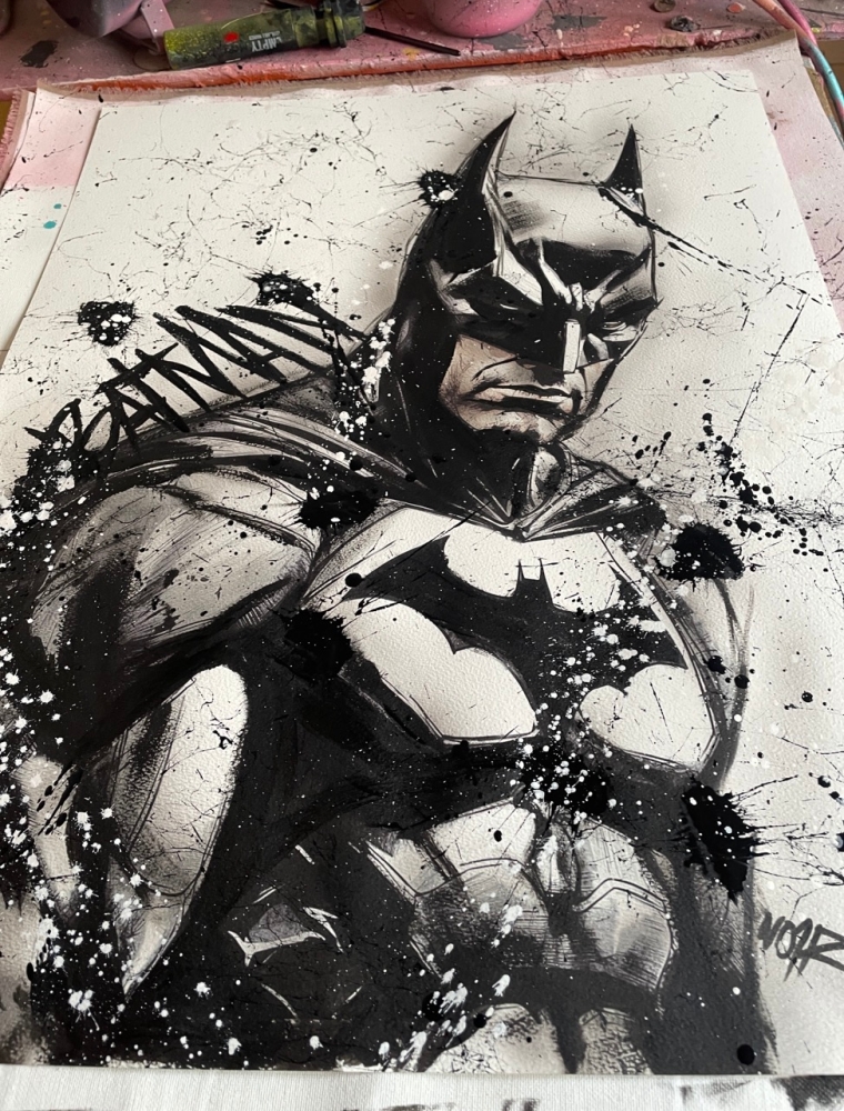COLLECTOR'S ITEM! "The Batman" Introducing an exceptional interpretation of this Noir's piece, this artwork is a mixed media on paper titled "The Batman" This exclusive edition highlights the artist's passion In every stroke, Noir's work reflects an unwavering commitment to the art form. -This is a unique work of art, hand-signed and with a certificate of authenticity, delivered to your door. -This is a Mixed Media Artwork on paper, so you should expect some flaws, imperfections splatters, small cracks or wrinkles can also happen, and when it does, it's part of the artwork, this is just the nature of the spray on paper. -Sent rolled in a tube. -Colors may shift due light conditions at the moment of the photo. *do not leave it in the tube. Noir, a passionate artist, discovered her deep-seated love for Urban art and Illustration from a tender age. Over the years, Noir's artistic journey has unfurled, expanding the skills into various creative realms, including concept art and digital painting, music, 3d sculpt and traditional painting. With an unbridled fervor for the diverse world of art, and armed with a background in visual arts, Noir's work reflects an unwavering commitment to the art form. Exploring Noir's portfolio is an invitation to enter a realm where imagination knows no bounds