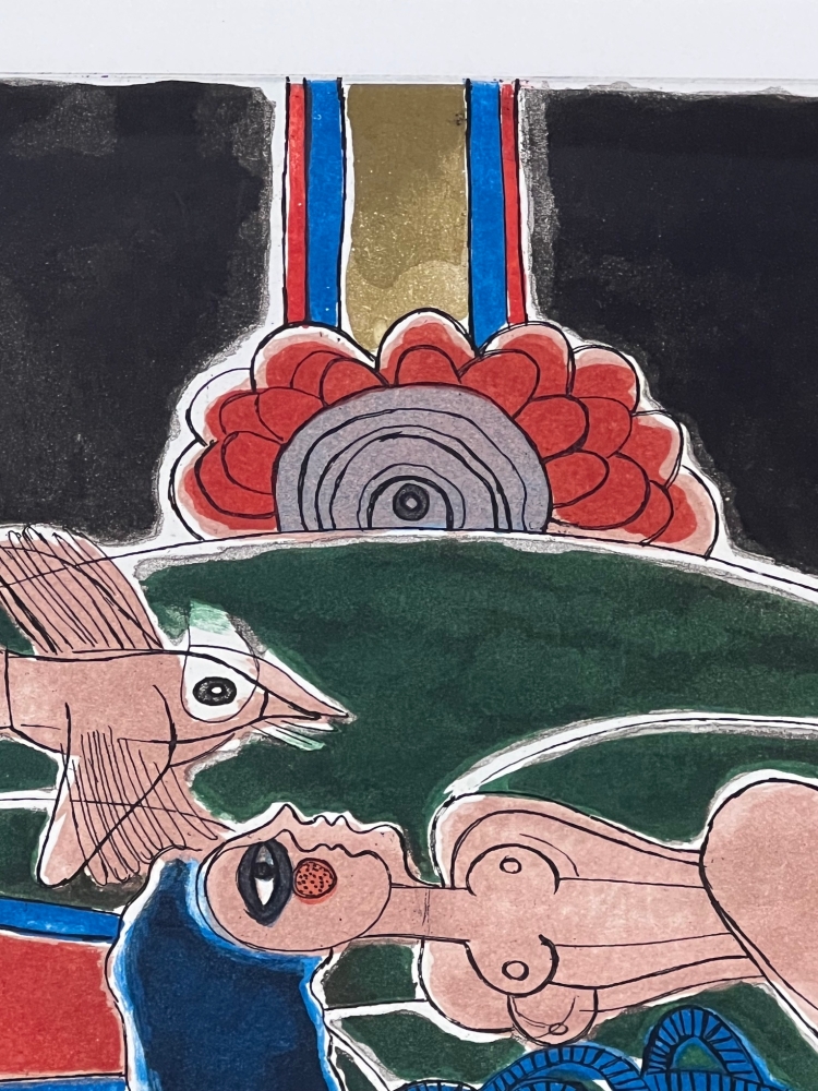 Nice large size etching by the painter Guillaume Corneille, artist proof, signed, titled and dated at the bottom by the painter. Painted and varnished solid wood frame dating from the artist's lifetime with Atelier Corneille stamp on the back. Each etching by Corneille is unique and presents variations of colors: Corneille worked on them in the engraving workshop in an artisanal way. The themes of exoticism and Africa are often present in the painter traveler. Total dimensions : 86 x 70 cm - Dimensions of the work : 57 x 42 cm. Good condition. The frame which is more than 20 years old presents some imperfections and scratches. Secure shipping in a cardboard box by UPS. Retrospective Guillaume Corneille in Belgium in 2024!