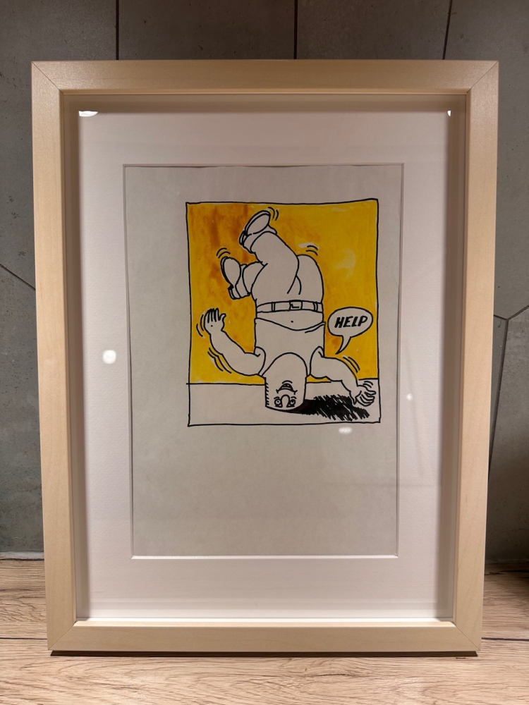 Zwarte stift tekening, met akwarel van Bruneau, Bruneau (geboren 1957 in Wilrijk, woont en werkt in Berchem) is een enthousiaste veelschilder. Zijn werk hoeft niet zo nodig een verklaring. Hij werkt graag in reeksen en rond eenvoudige thema's als de hoed of de stoel. Zijn schilder- en tekenstijl refereert aan strips, cartoons en soms Keith Haring.