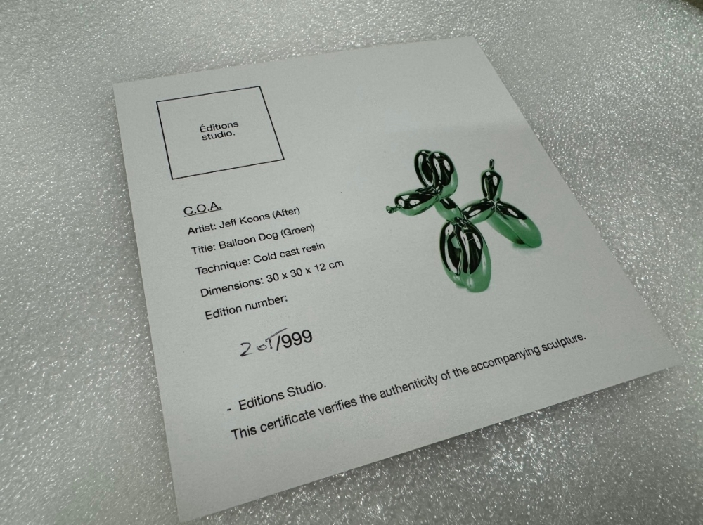 Resin sculpture after Jeff Koons, published by Éditions Studio. Edition limited to 999 pieces, of which this number is 205. The sculpture comes with the original packaging and is accompanied by the original certificate. Sculpture is in good to excellent condition. Private collection sale. VERY rare color!