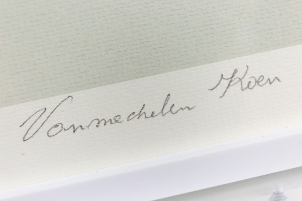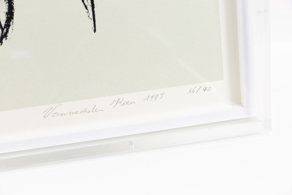 Short edition Silkscreen koen Vanmechelen from 1998, Koen Vanmechelen started working in 1998 on what would later become The Cosmopolitan Chicken Project or (CCP), a unique artistic project that he launched in the late nineties. In this project, the chicken is central and more specifically the crossing of national chicken breeds into "cosmopolitan chickens". Work that is rarely offered for sale. Always kept in folder and now placed in scratch-free plexi frame. Plexi frame is equipped with suspension system. This edition is numbered on a small edition of 40 pieces and signed by hand.