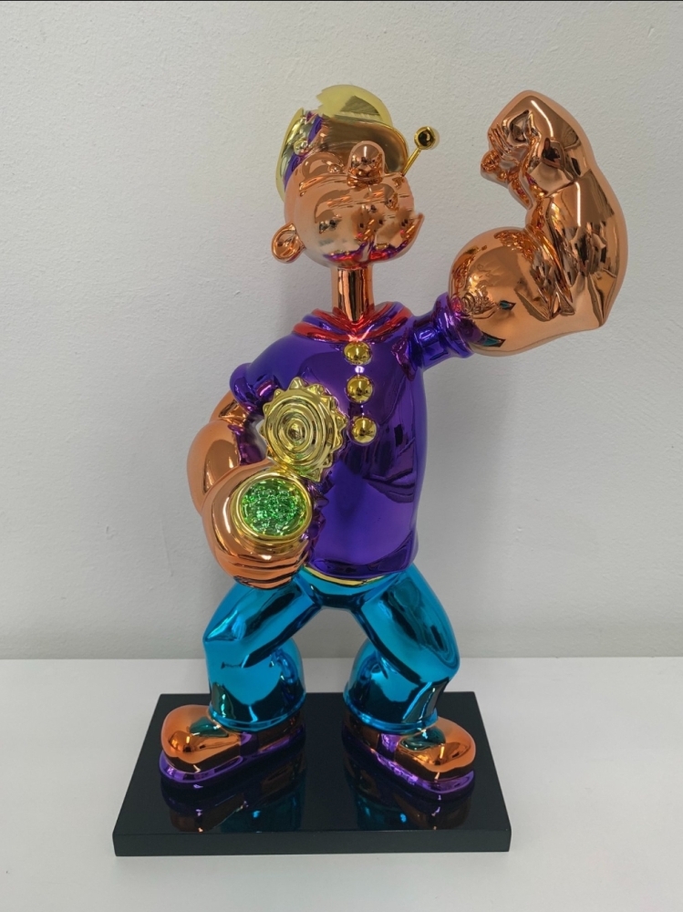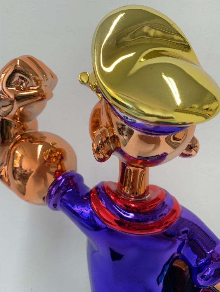 Popeye sculptuur naar Jeff Koon's Popeye uit 2009-2011. Tussen 2009 en 2011 werden drie Popeye-sculpturen gemaakt uit staal, elk 2 meter hoog. Dit kleine beeldje is een replica van de beroemde modellen van Koons.
