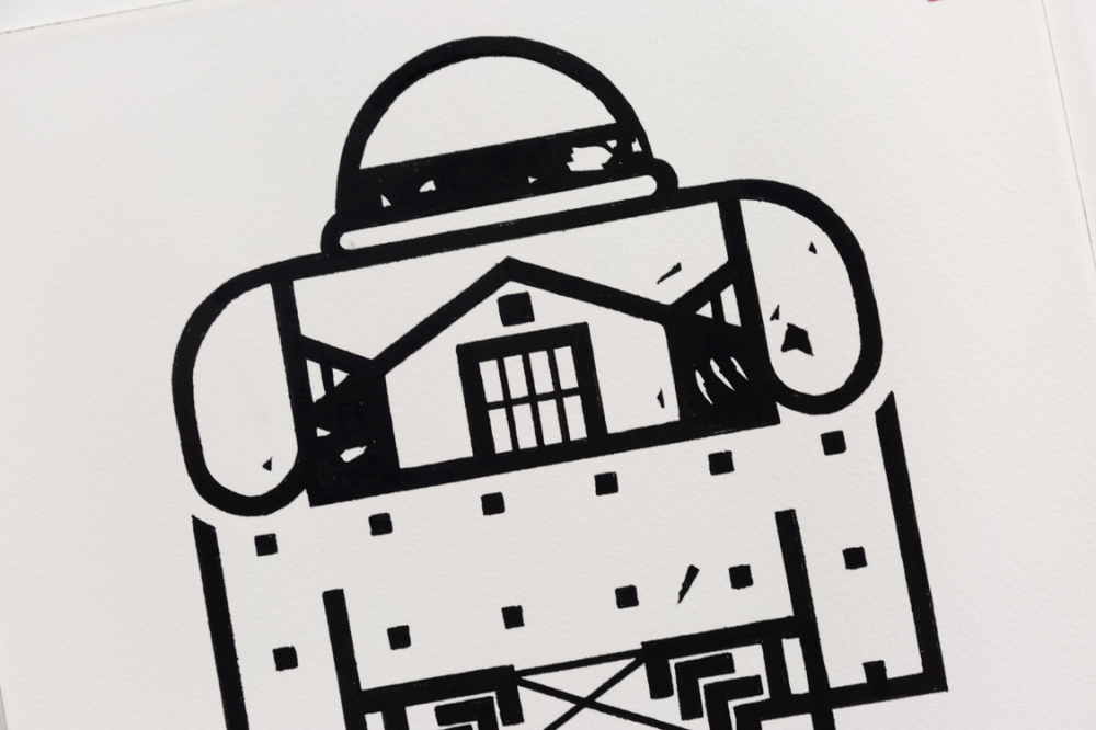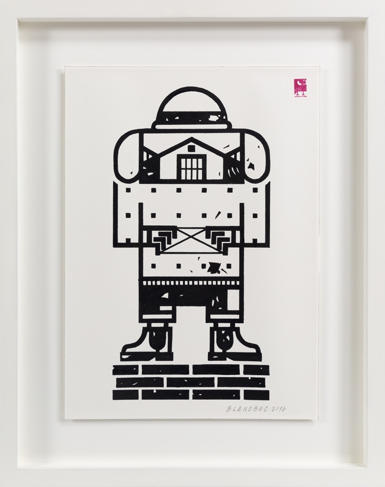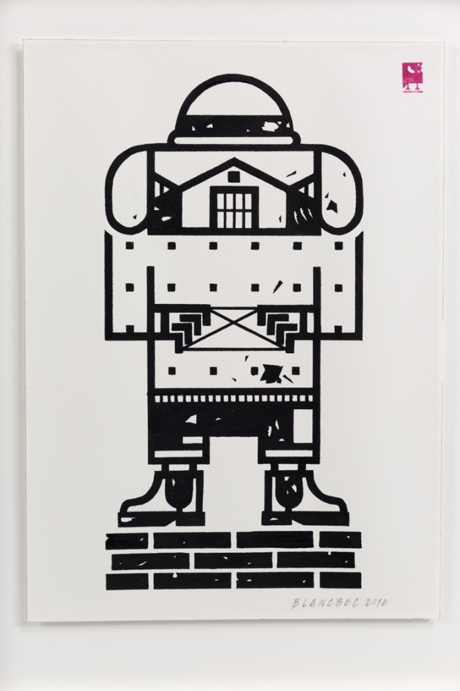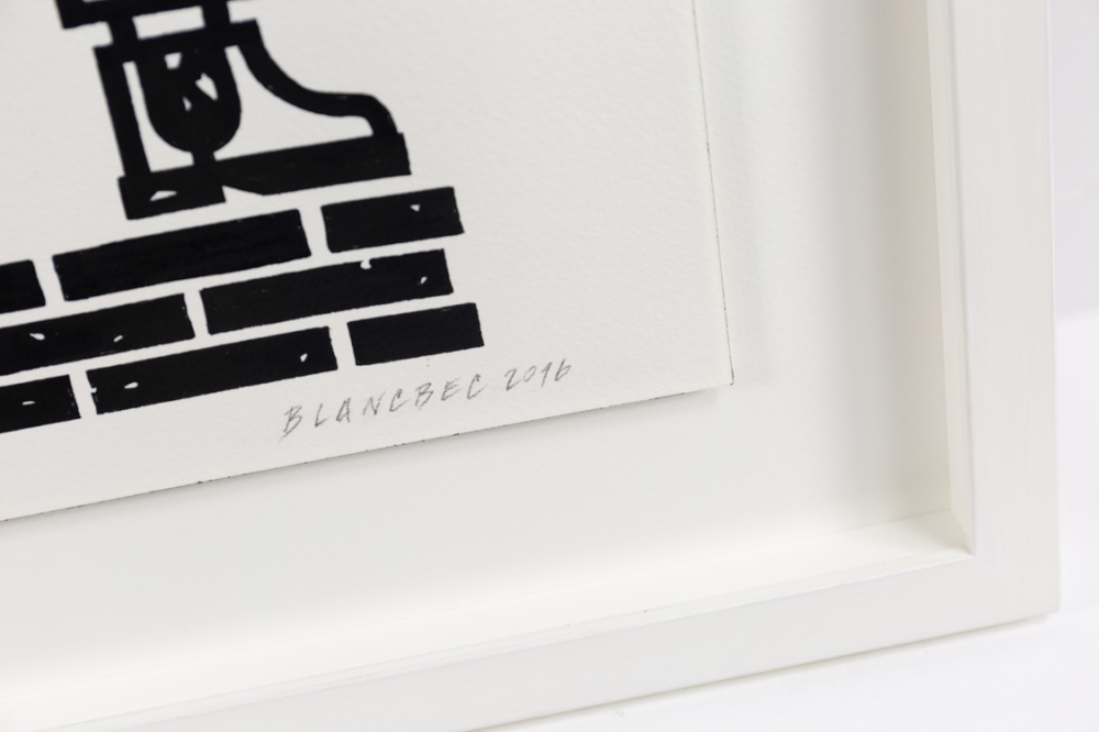 Uniek schilderij van Brusselse street art kunstenaar Blancbec. Erg mooi zwevend ingelijst met ontspiegeld museumglas. Dit werk kadert binnen zijn expositie "Trafik" uit 2016 en is vrij kenmerkend voor de stijl van Blancbec. Waar blancbec toch vaak met kleuren werkt koos hij hier voor een doordringend contrast van het zwarte beeld op een helderwitte achtergrond.