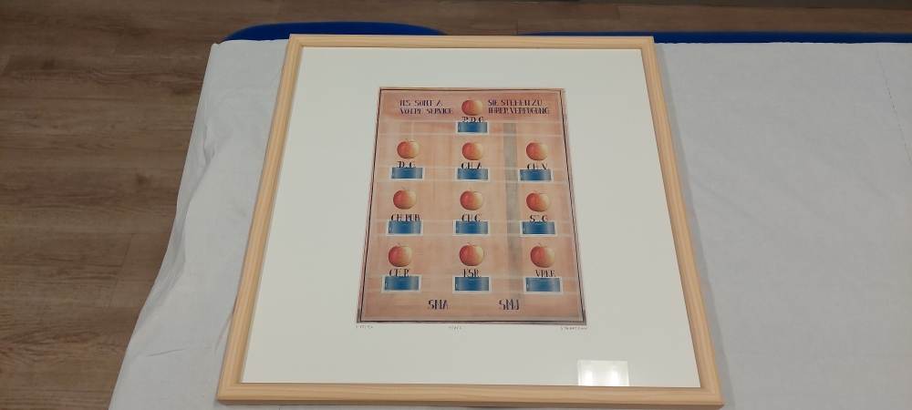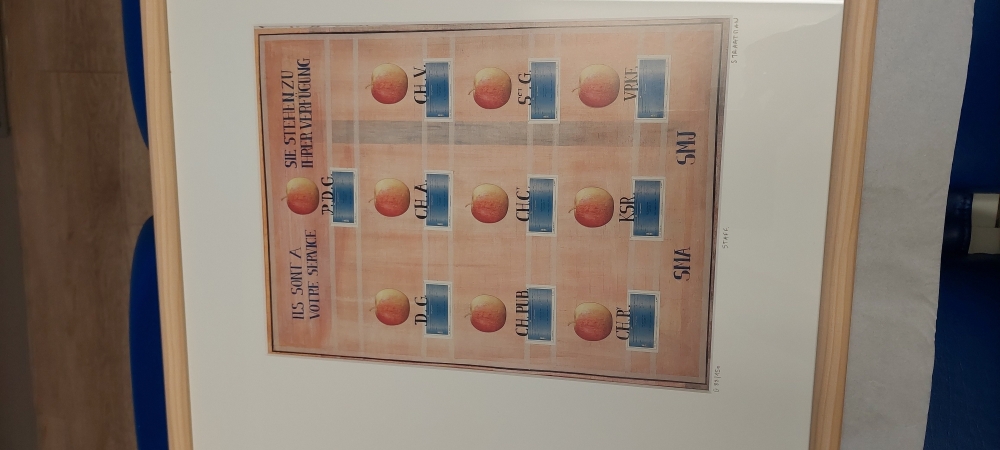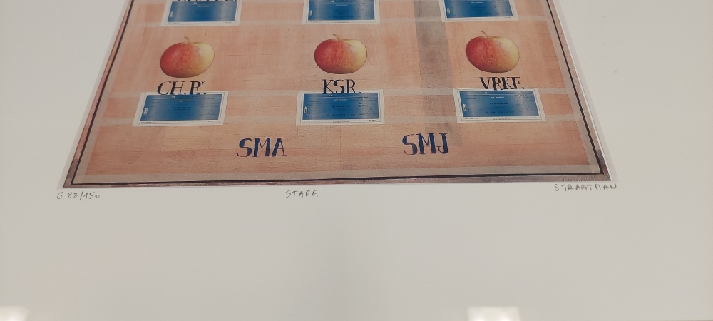 Zeldzame kleurenlithografie (88/150) getiteld 'Staff' uit de serie 'Maison belge, Supermarché de l'année' van de Spaanse surrealist Angel Vergara onder zijn pseudoniem Straatman. In potlood gesigneerd door de meester (alsook titulatuur en uitgave). Professioneel ingekaderd.