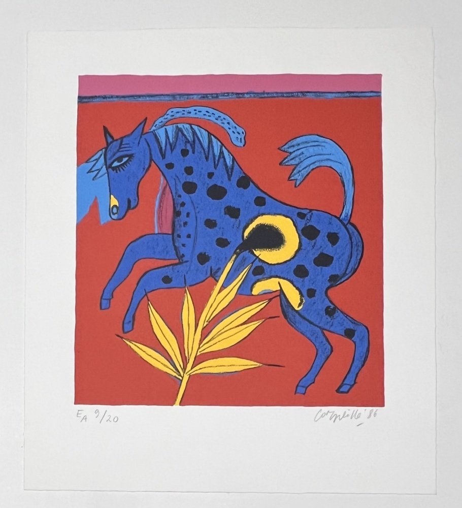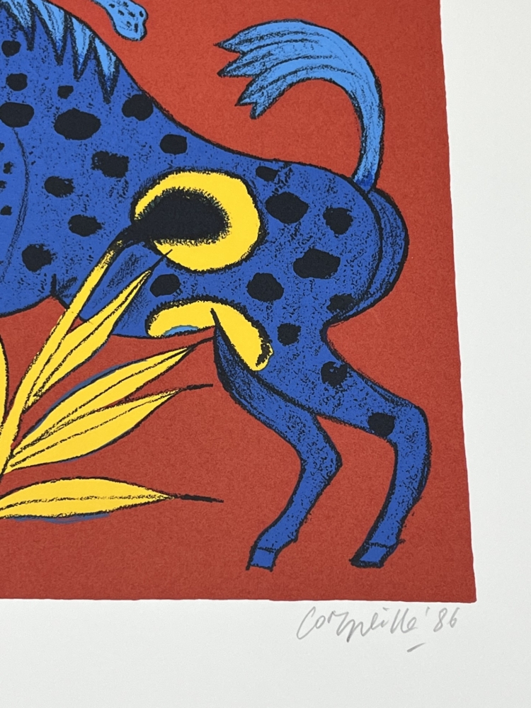 Warning: an unusual work! One of the painter's most sought-after works! And a nod to Der blaue Reiter in Munich (Kandinsky, Franz Marc...). Picasso had his favourite animals: the bull, his dog Lump and his goat. Guillaume Corneille's bestiary included countless animals: greyhounds, cats, fish, elephants and all kinds of birds, in highly colourful works in the wake of Matisse, Gauguin and Van Gogh. Original serigraph by the painter Guillaume Corneille (1922-2010), born in Liège of Dutch parents and a founding member of the Cobra group with Karel Appel, Asger Jorn, Constant, Dotremont and later Alechinsky and Jacques Doucet. Signed and dated in pencil by the artist. Artist's copy E/A 9/20 Total dimensions : 46 x 40 cm - Perfect condition - Secure shipping with UPS Identified as an important figure in the renewal of abstraction in Northern Europe, from 1967 Corneille gradually moved towards a rich and colourful Nouvelle Figuration that coordinated with the Pop Art taste of the 1960s and 1970s, and exhibited alongside Andy Warhol, Arman, César and others.