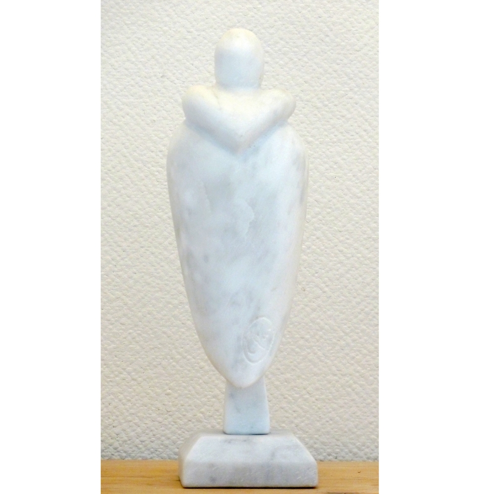 Statuette sculptée, par taille directe, dans un bloc de Marbre Blanc MichelAngelo de Carrare (Italie). Sculptée manuellement dans mon atelier à Mougins. Pièce unique neuve. Dimensions : 25/9/6 cm Signature gravée au dos de la statuette. Certificat d'authenticité signé par l'artiste.