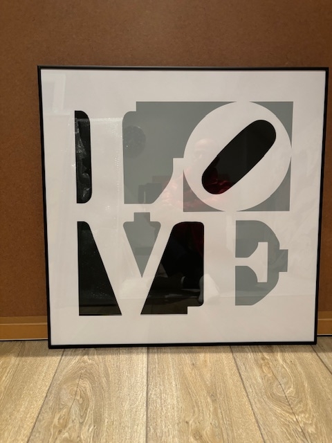 Mooi werk met de iconische letters LOVE van de bekende kunstenaar Robert Indiana. Professioneel ingelijst met glas en aluminium kader. Zeer decoratief pop art werk. Dit is de uitgave is grijs en zwart.