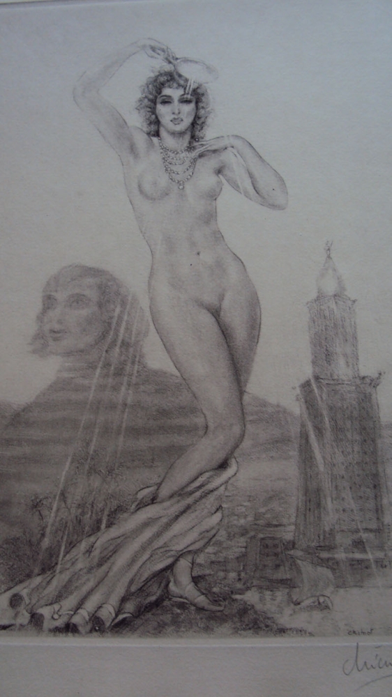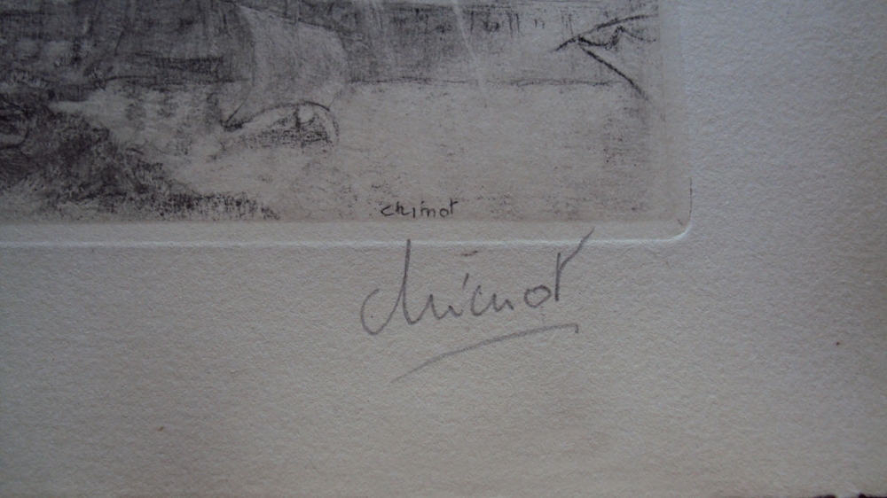 Edouard Chimot 1949 etching for the book by Pierre Louÿs 'Les Poemes Antiques. Artwork is handsigned bottom right. Size : 32,3 x 24,9 cm. The etching is in mint condition. Édouard Chimot's work has been offered at auction multiple times, with realized prices ranging from 200 USD to 9,806 USD, depending on the size and medium of the artwork. Since 2001 the record price for this artist at auction is 9,806 USD for Female Nudes, sold at Sotheby's London in 2012.