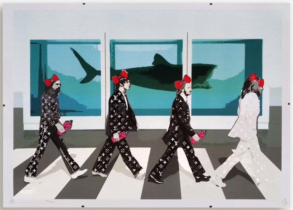Original silkscreen on 300 gr Fine Art paper. Dimensions 45 x 32 cm (17.7" x 12.6") Signed and dated 2020 by the artist. Edition: AP (Artist Proof) Mounted in clip frame, ready to hang. Clip frame is provided with clear, anti-reflective plexiglas and an MDF back wall. Supplied with COA and gold adhesive seal sticker of Death NYC. Details of the silkscreen: The Beatles - Damien Hirst The Physical Impossibility of Death in the Mind of Someone Living - Louis Vuitton costume & spray can Death NYC is the nickname of a New York street artist and an acronym for "Don't Easily Abandon The Hope". Her work is based on the derivation of images and artworks from popular culture.