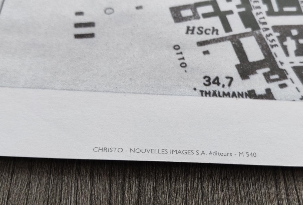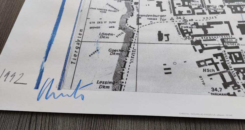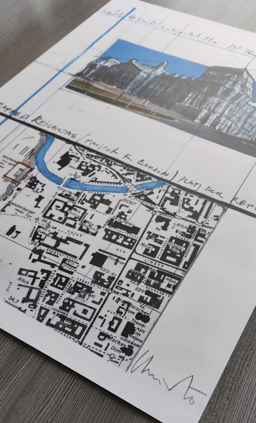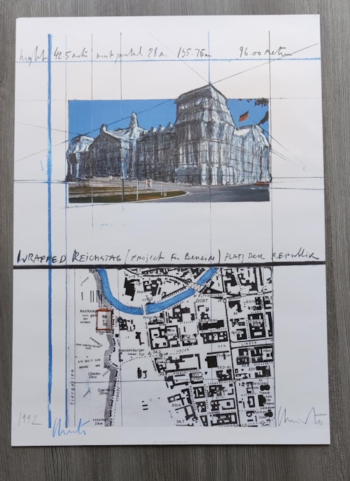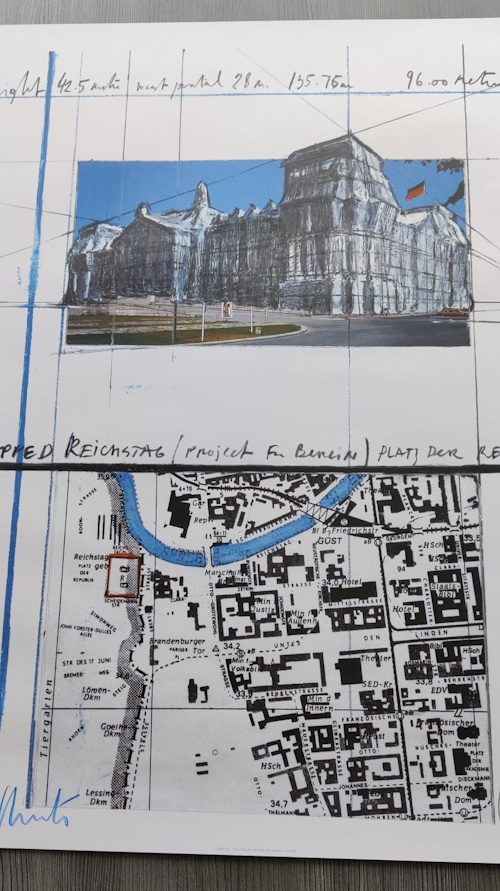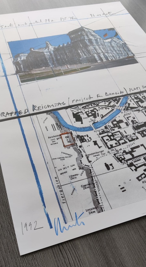 CHRISTO VLADIMIROV JAVACHEFF, "CHRISTO". Poster in goede conditie Thema "Wrapped Reichstag, Project for West Berlin", Getekend in druk en originele handtekening als extra, 1992. Afmeting 70 cm x 50 cm