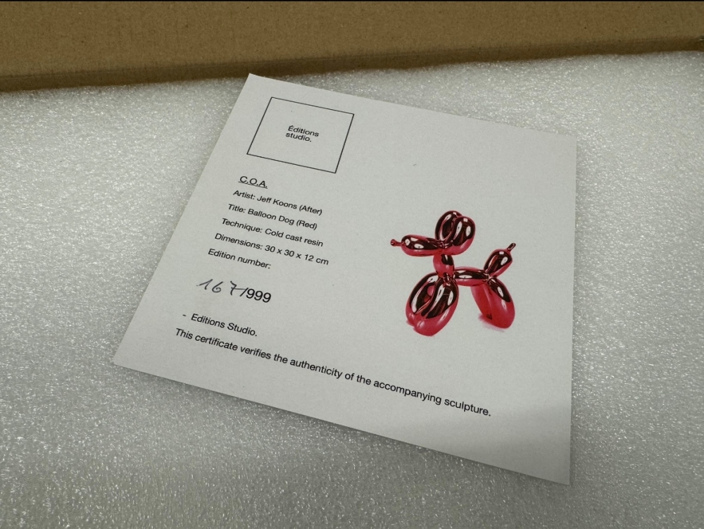Resin sculpture after Jeff Koons, published by Éditions Studio. Edition limited to 999 pieces, of which this number is 167. The sculpture comes with the original packaging and is accompanied by the original certificate. Sculpture is in good to excellent condition. Private collection sale.