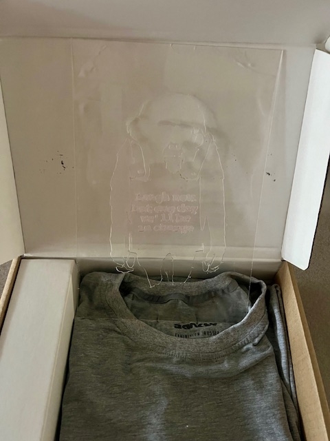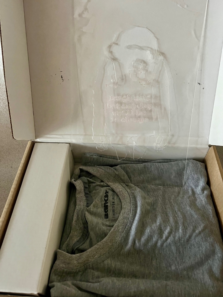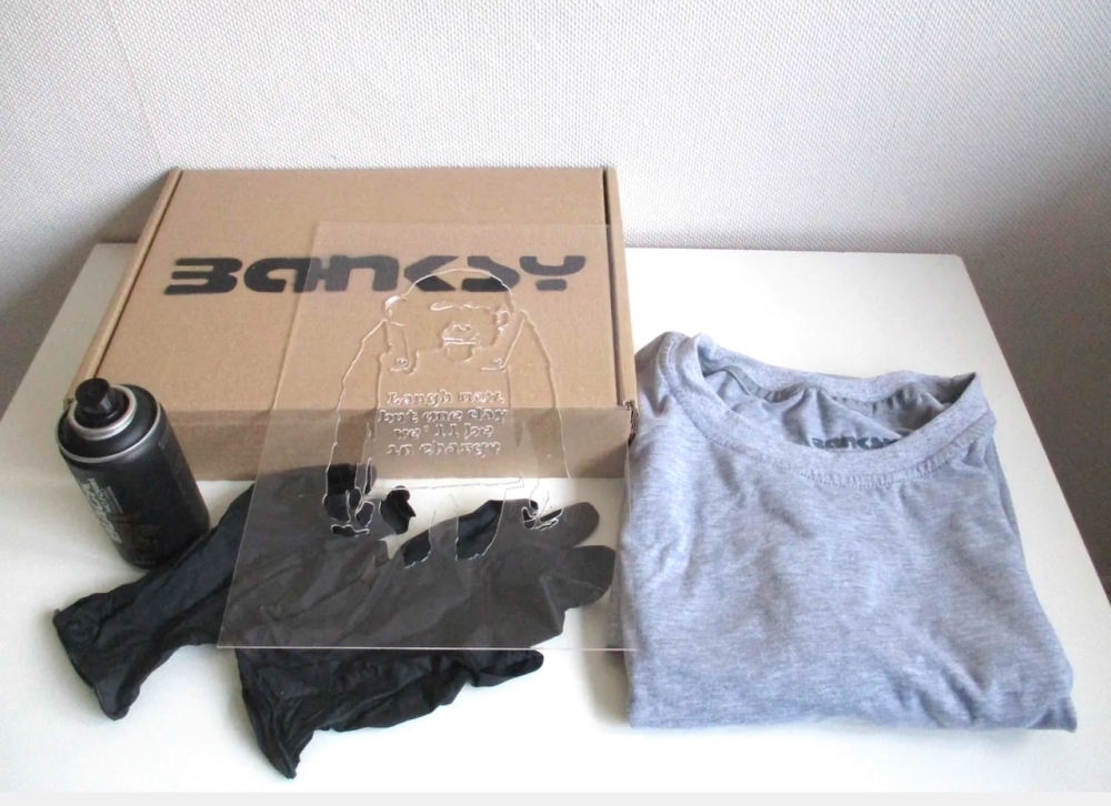 Dit is een stencil kit in beperkte oplage die exclusief werd verkocht tijdens de Banksy Exhibition in Moskou in 2018. Het pakket bevat: 1 Doos met Banksy op in zwarte spuitverf. 1 Montana Zwart 150ml spuitbus 1 paar zwarte latex handschoenen 1 BANKSY lichtgrijs large T-shirt (blanco) 1 'Laugh Now' stencil/sjabloon in plexiglas. Afmetingen doos: 33 x 23 x 6,5 cm. Doos , t-shirt , spuitbus zijn in perfecte Nieuwstraat , het plexi stencil heeft wel wat krassen en gebruikssporen zie fotos maar perfect bruikbaar natuurlijk. Het aangeboden pakket is compleet.