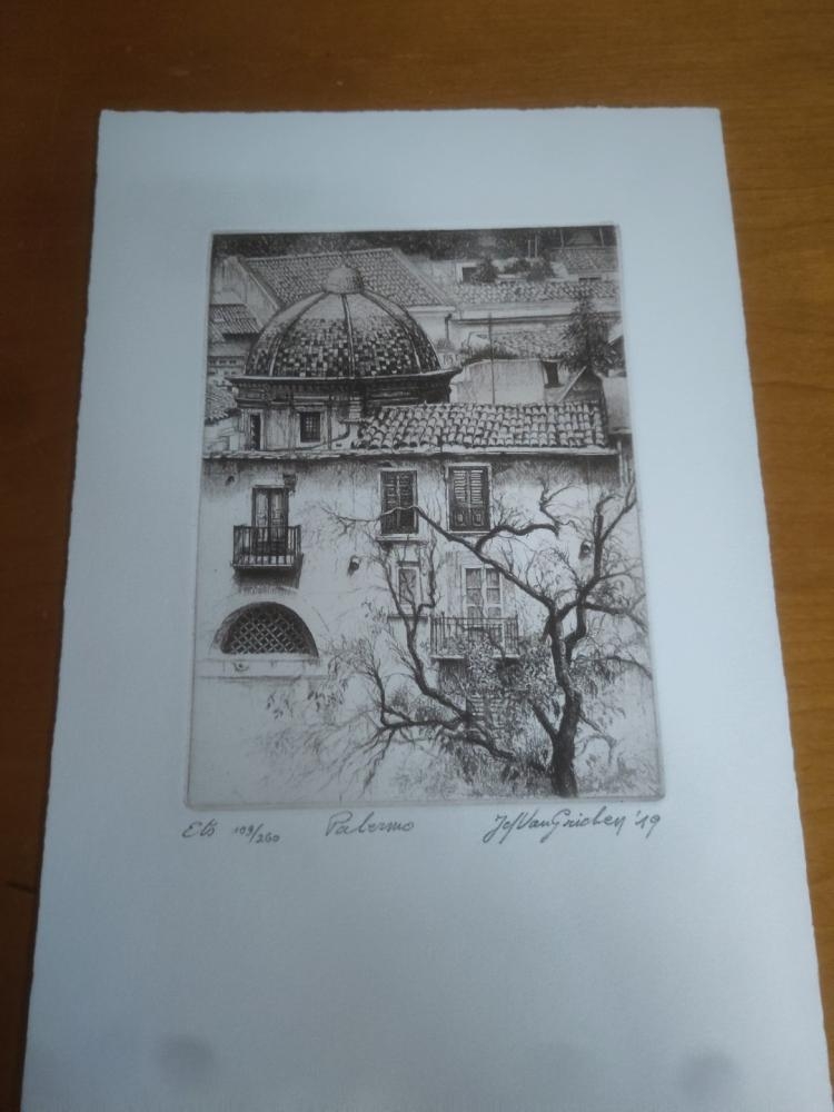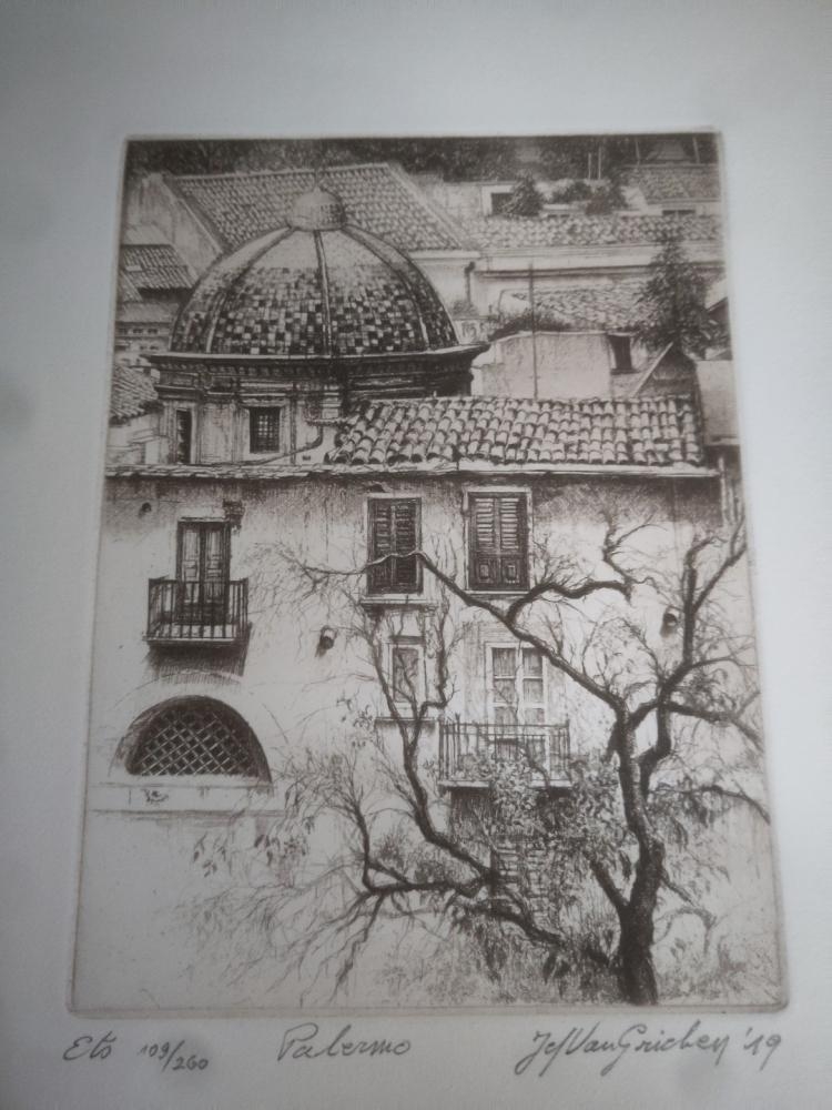 De Vlaamse kunstenaar Jef Van Grieken observeert de ruimtelijkheid, tast en stapt de omgeving af als een landmeter, kiest en selecteert wat het meest indruk op hem maakt, vervolgens tekent en construeert hij in zijn hoofd het beeld dat hij ervan wil maken. Dan pas begint het echte werk. De voortdurende toevloed aan nieuwe impressies filtert hij tot een herkenbaar onderdeel van zijn geschakeerd oeuvre. Palermo: een zicht van Palermo vanuit het nieuwe rectoraat van de universiteit van de stad, die Jef Van Grieken enkele malen heeft bezocht en hem steeds voldoening en inspiratie geeft