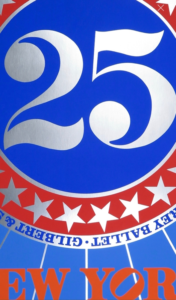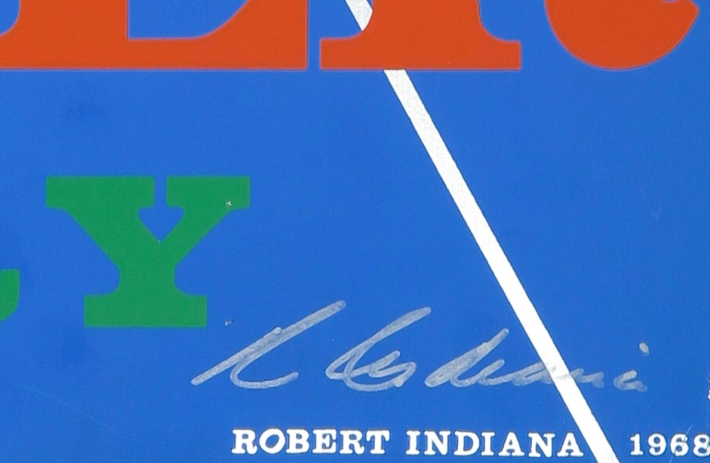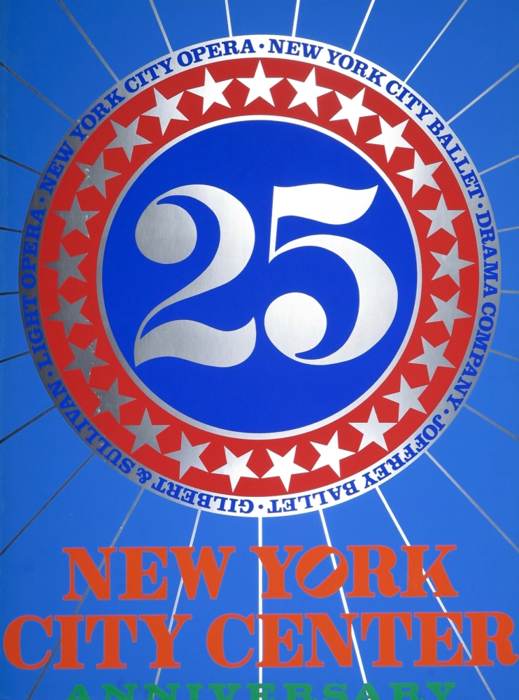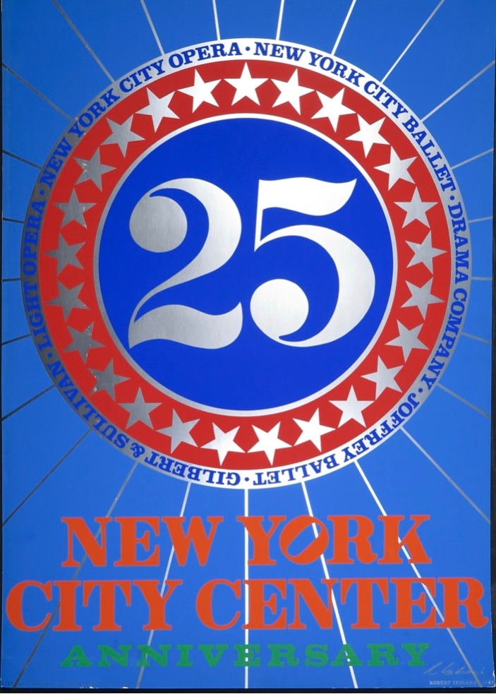 Prachtige en zeldzame zeefdruk van Robert Indiana. Met de hand gesigneerd Het gaat om een zeefdruk van de affiche die hij ontwerpen had ter gelegenheid van het 25-jarig bestaan van het New York City Center. Het werk heeft een paar ouderdom sporen langs de randen.