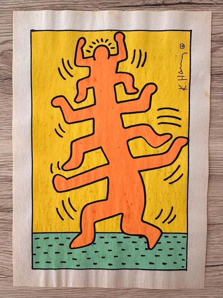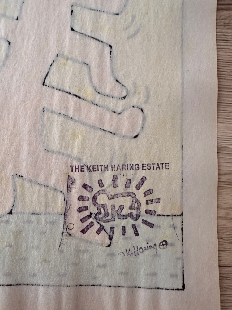 Originele tekening in stift met stempel op de keerzijde van de Keith Haring Estate Keith Haring was een Amerikaans kunstenaar. De kunst die Keith Haring maakte wordt soms popart genoemd, maar ook de termen graffiti-art en moderne kunst worden gebruikt. Zijn cartoonachtige schilderingen en tekeningen gingen onder andere over aids, drugs en apartheid Merk op dat de Keith Haring Foundation al vele jaren geen certificaat van echtheid (COA) uitschrijft. Werken van Keith Haring, die niet kunnen gevonden worden in één van de catalogi van Haring, worden daarom bij ArtAuction.online steeds als "after" of "naar" gemarkeerd omdat we deze niet kunnen attesteren.